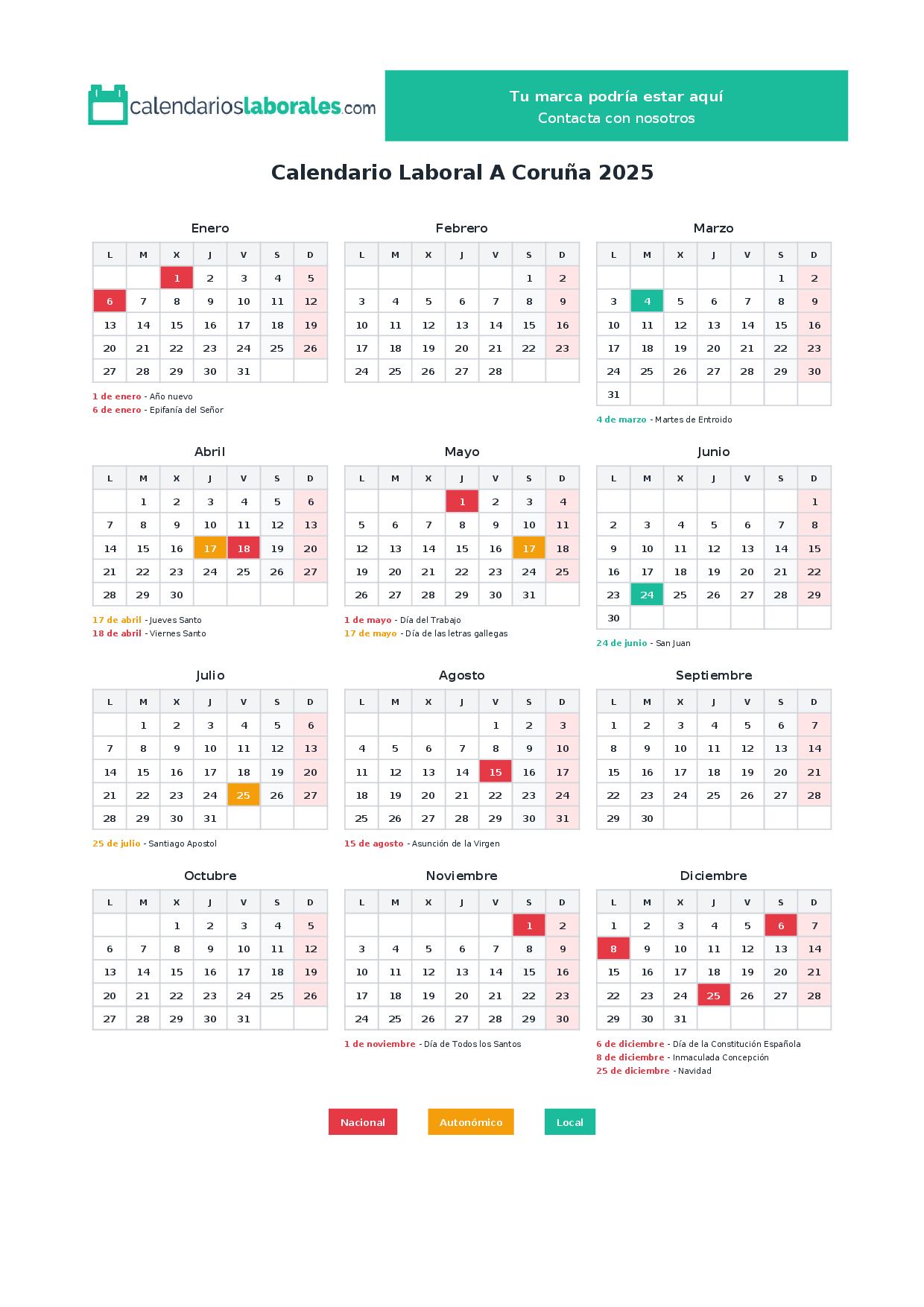 El calendario laboral de A Coruña en 2025 cuenta con un total de 14 días festivos, que incluyen festivos nacionales, festivos autonómicos de Galicia y los festivos locales establecidos por cada municipio.