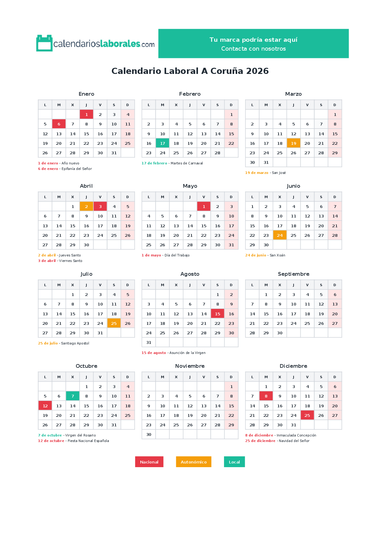 El calendario laboral de A Coruña en 2026 cuenta con un total de 14 días festivos, que incluyen festivos nacionales, festivos autonómicos de Galicia y los festivos locales establecidos por cada municipio.