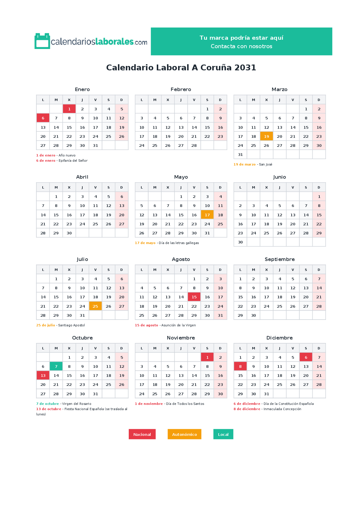 Calendario laboral A Coruña 2031