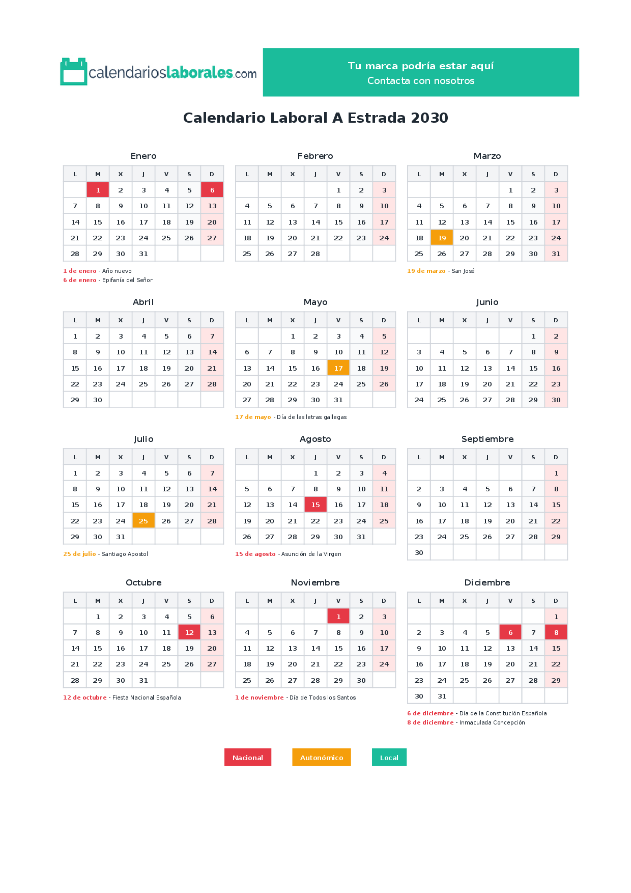 Calendario laboral A Estrada 2030