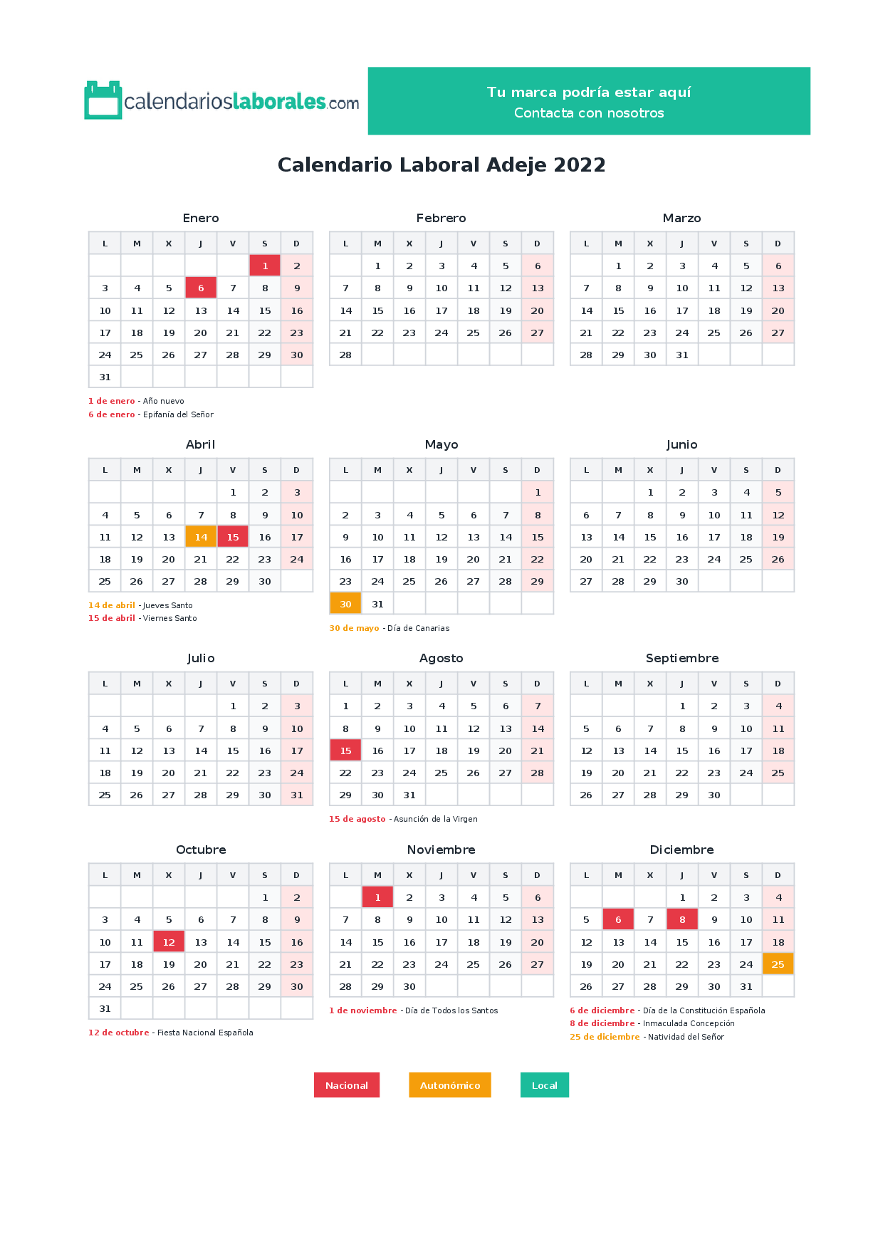 Calendario laboral Adeje 2022