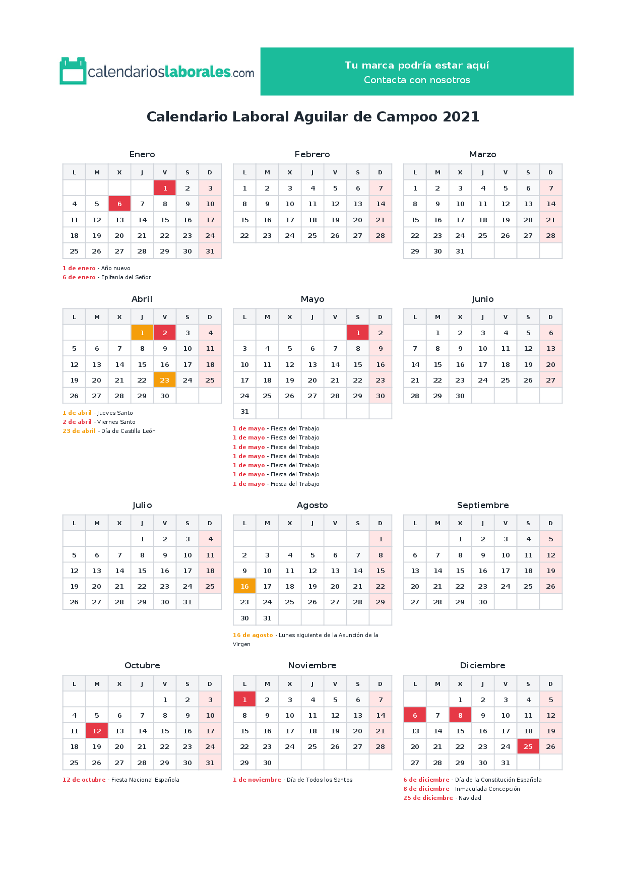 El calendario laboral de Aguilar de Campoo en 2021 incluye un total de 12 días festivos, que combinan festivos nacionales, festivos autonómicos de Castilla León y los festivos locales propios del municipio.
