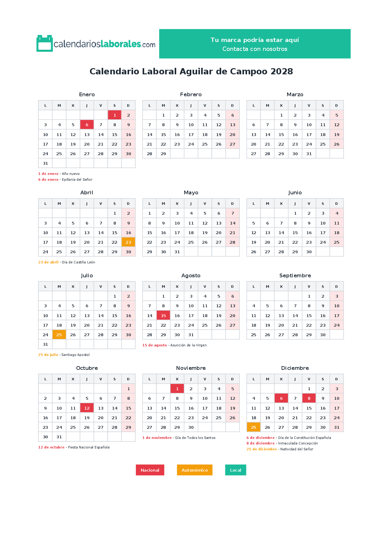 El calendario laboral de Aguilar de Campoo en 2028 incluye un total de 10 días festivos, que combinan festivos nacionales, festivos autonómicos de Castilla León y los festivos locales propios del municipio.