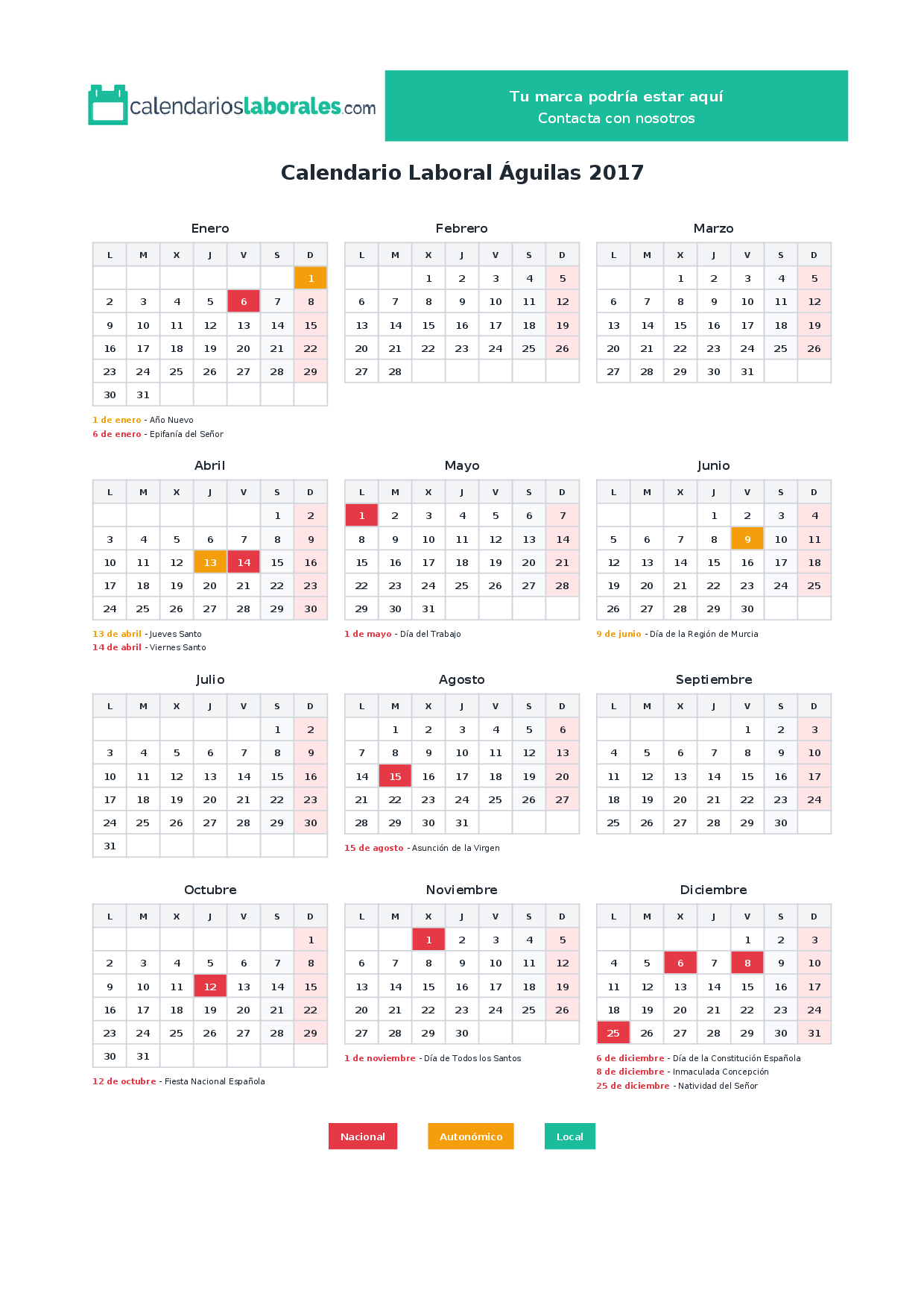 En 2017, 9 festivos nacionales se celebran en todo el territorio español, incluidos en el calendario laboral de Águilas.