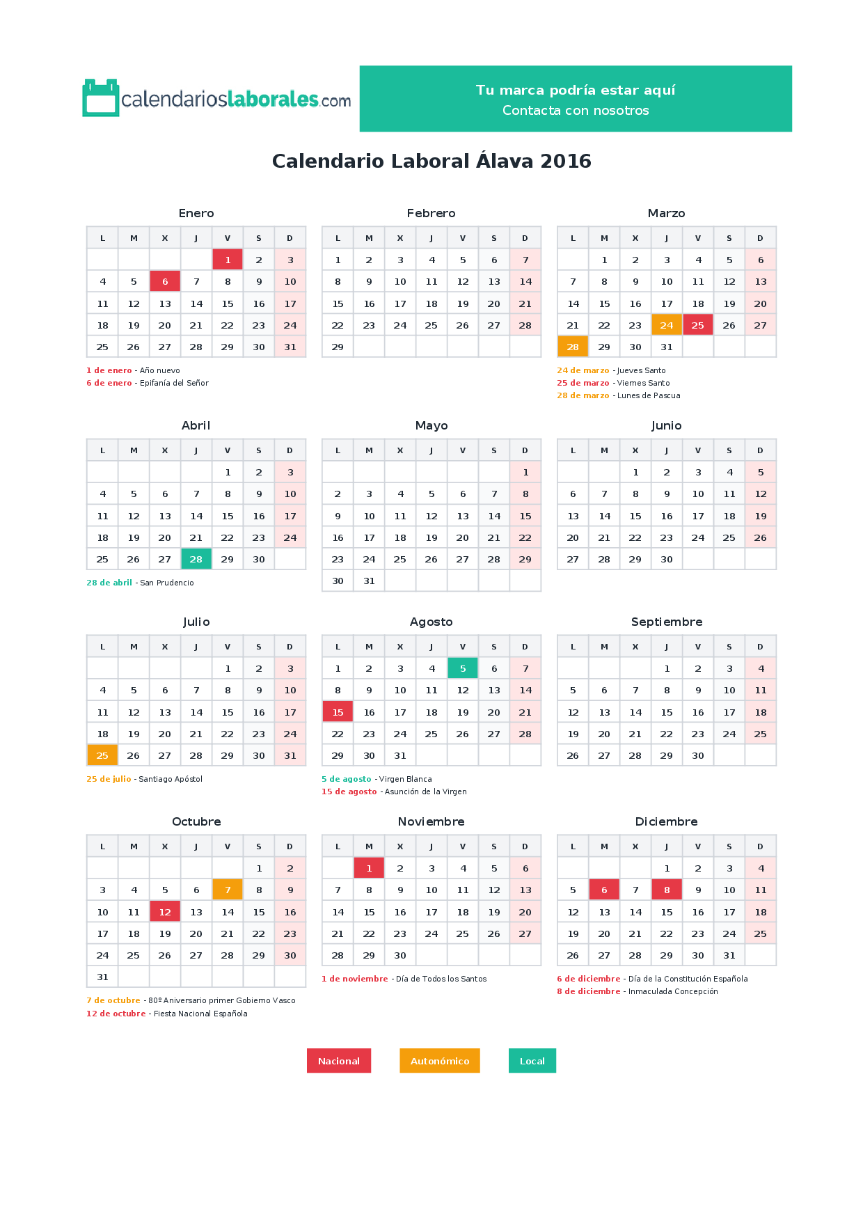 Puedes consultar también el calendario laboral completo de País Vasco 2016 o el calendario laboral de España para conocer el detalle nacional.