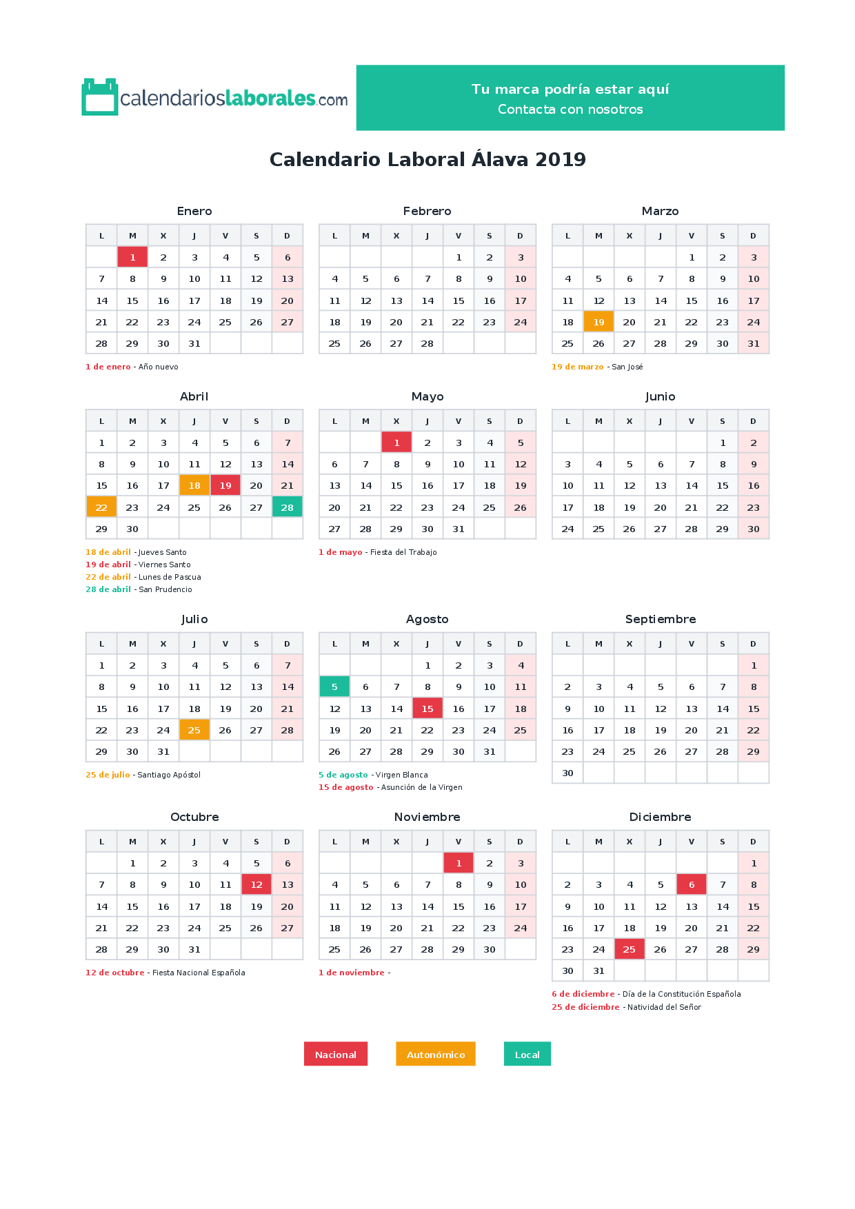 El calendario laboral de Álava en 2019 cuenta con un total de 14 días festivos, que incluyen festivos nacionales, festivos autonómicos de País Vasco y los festivos locales establecidos por cada municipio.