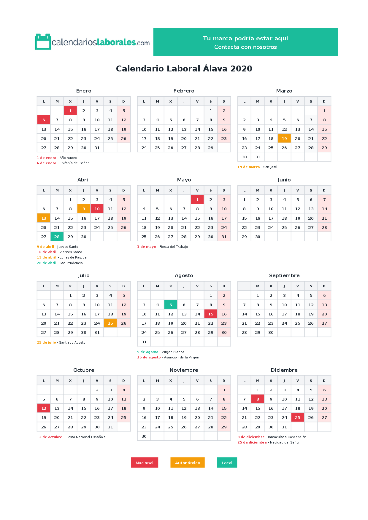 Festivos nacionales en Álava 2020