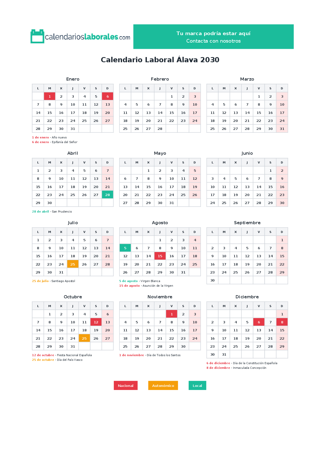 El calendario laboral de Álava en 2030 cuenta con un total de 11 días festivos, que incluyen festivos nacionales, festivos autonómicos de País Vasco y los festivos locales establecidos por cada municipio.