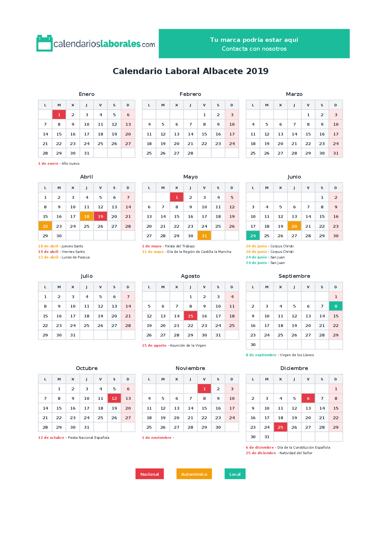 El calendario laboral de Albacete en 2019 cuenta con un total de 14 días festivos, que incluyen festivos nacionales, festivos autonómicos de Castilla La Mancha y los festivos locales establecidos por cada municipio.
