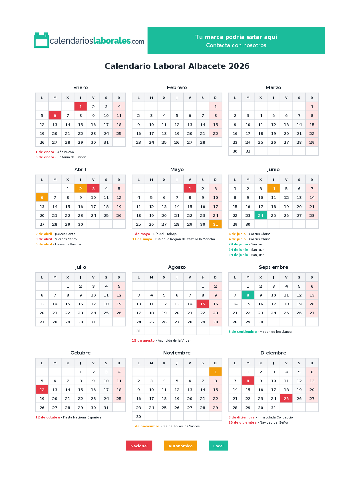 El calendario laboral de Albacete en 2026 cuenta con un total de 15 días festivos, que incluyen festivos nacionales, festivos autonómicos de Castilla La Mancha y los festivos locales establecidos por cada municipio.