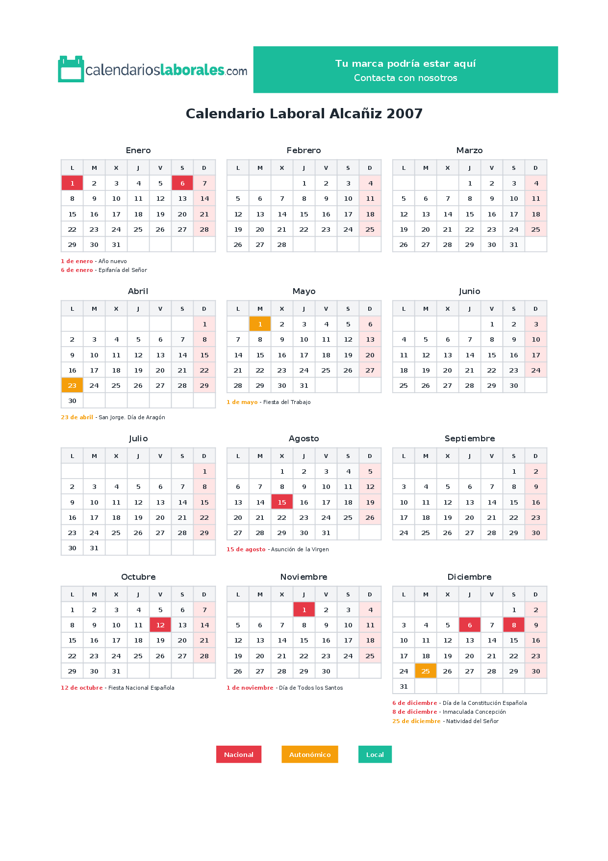 En 2007, 7 festivos nacionales se celebran en todo el territorio español, incluidos en el calendario laboral de Alcañiz.