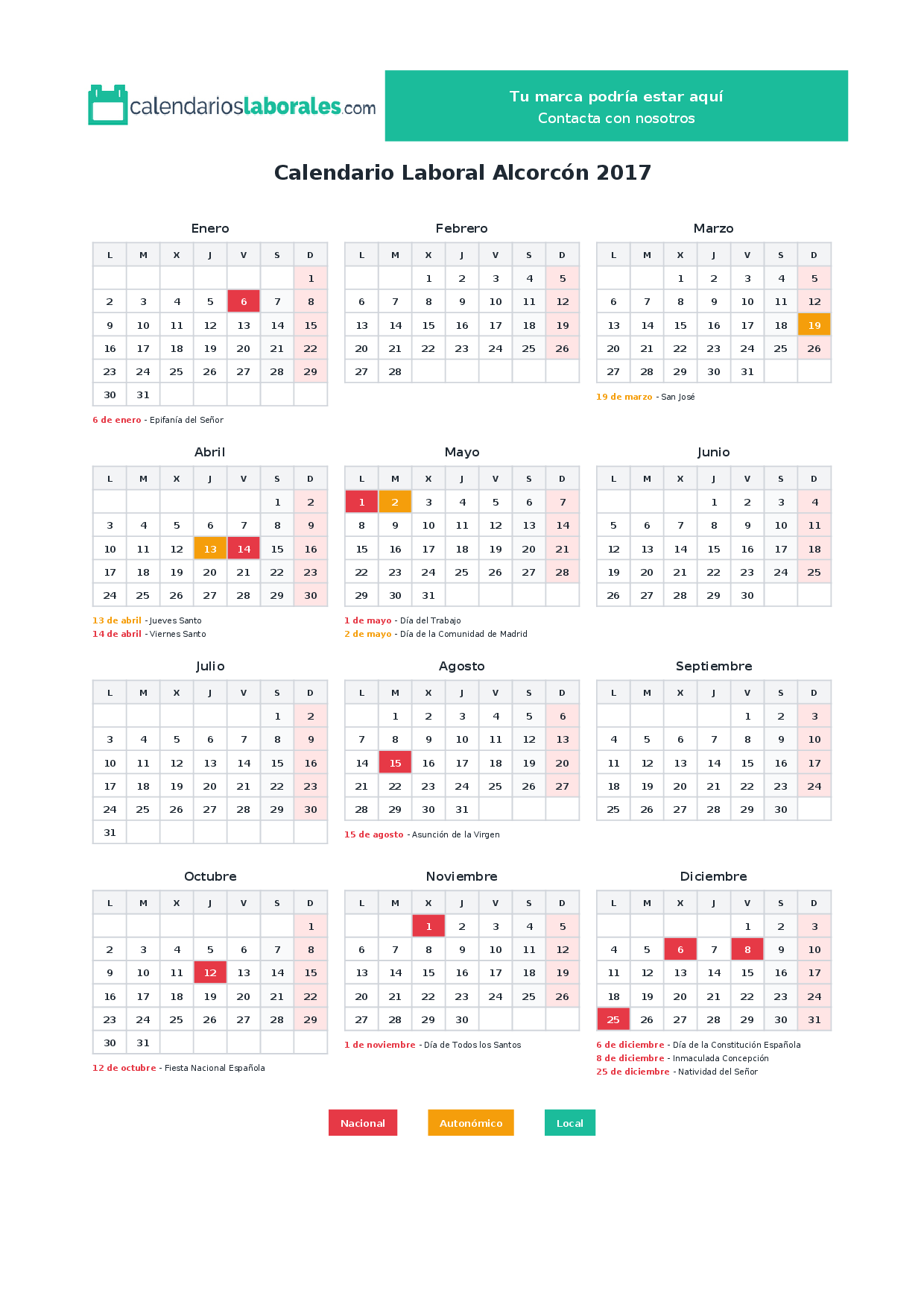 En 2017, 9 festivos nacionales se celebran en todo el territorio español, incluidos en el calendario laboral de Alcorcón.