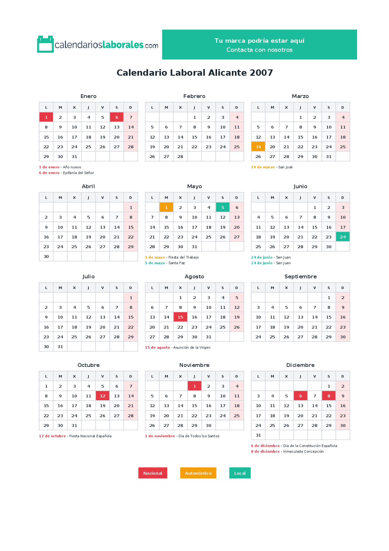 El calendario laboral de Alicante en 2007 cuenta con un total de 11 días festivos, que incluyen festivos nacionales, festivos autonómicos de Comunidad Valenciana y los festivos locales establecidos por cada municipio.