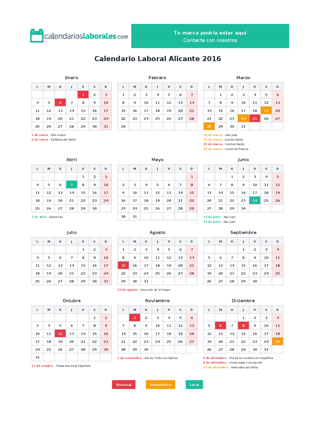 El calendario laboral de Alicante en 2016 cuenta con un total de 14 días festivos, que incluyen festivos nacionales, festivos autonómicos de Comunidad Valenciana y los festivos locales establecidos por cada municipio.