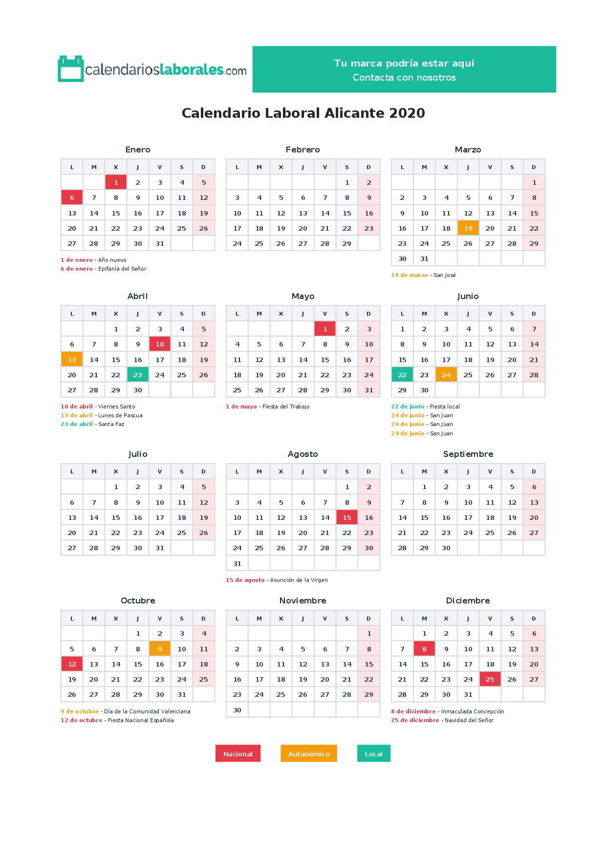 Calendario laboral Alicante 2020