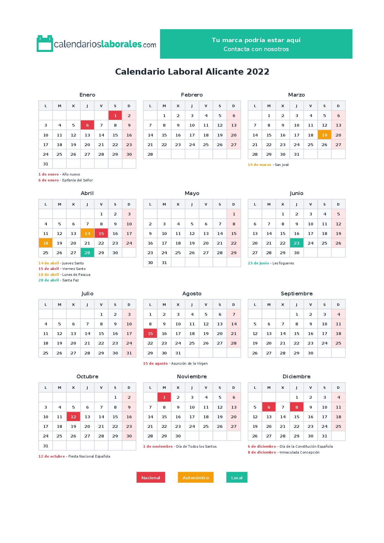 El calendario laboral de Alicante en 2022 cuenta con un total de 13 días festivos, que incluyen festivos nacionales, festivos autonómicos de Comunidad Valenciana y los festivos locales establecidos por cada municipio.