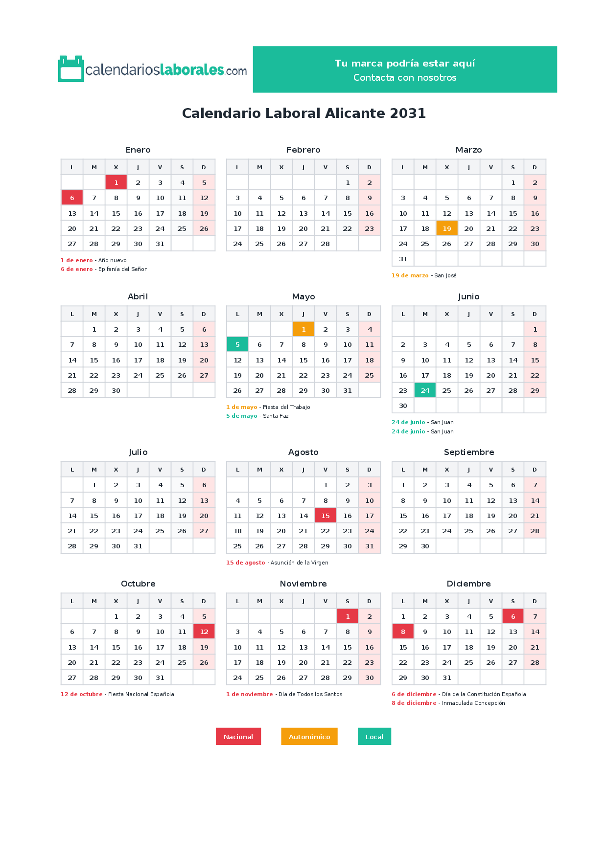 Calendario laboral Alicante 2031
