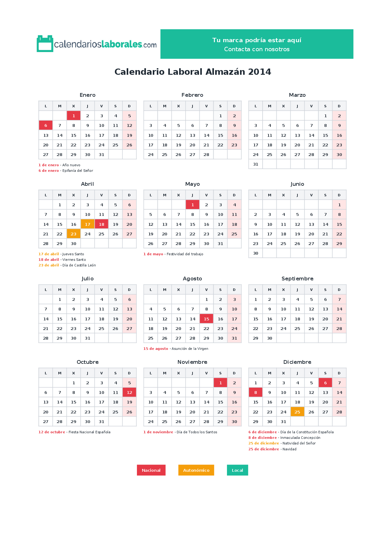 En 2014, 10 festivos nacionales se celebran en todo el territorio español, incluidos en el calendario laboral de Almazán.