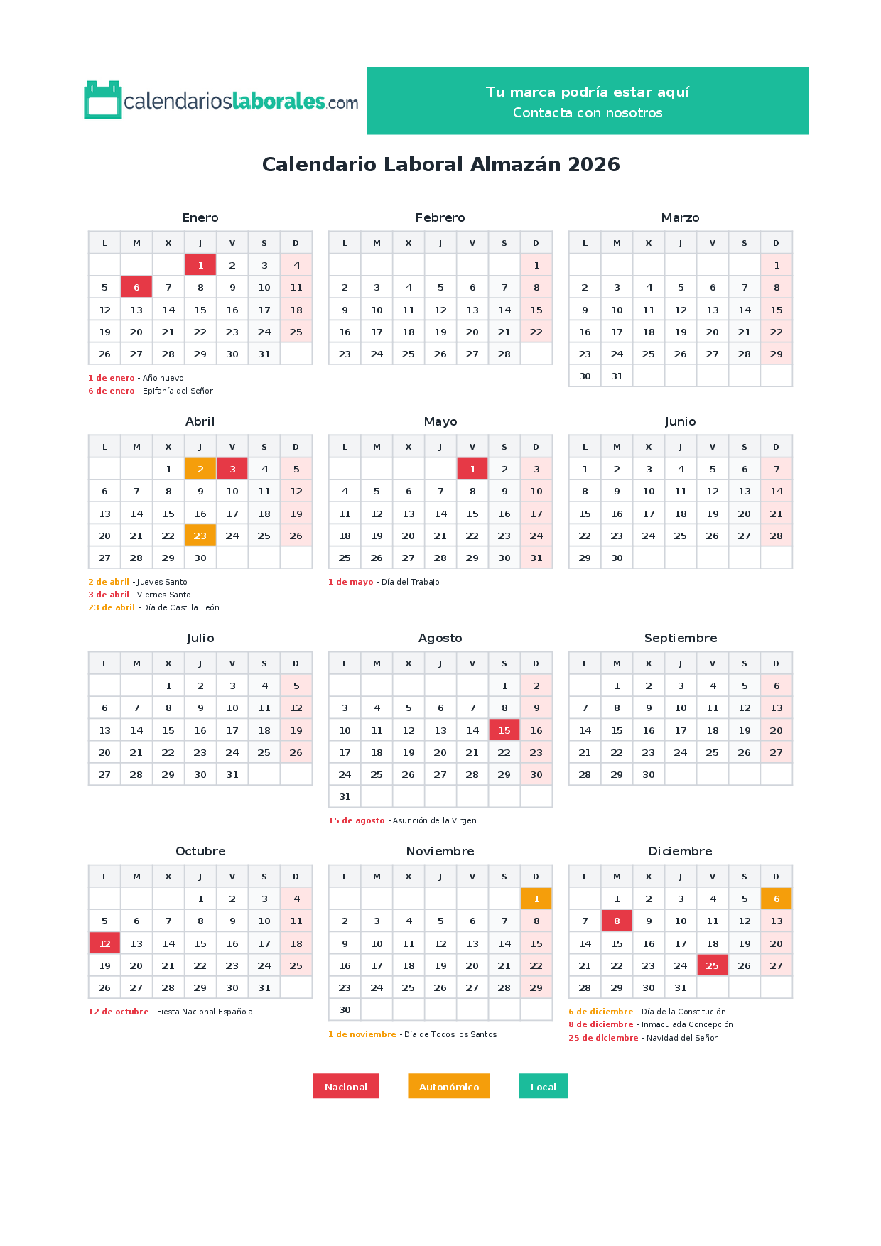 Además, el Ayuntamiento de Almazán fija 0 festivos locales que completan el calendario laboral del municipio.