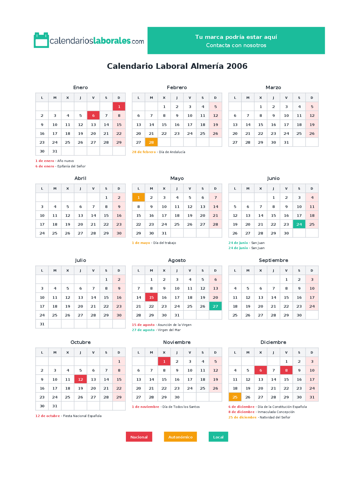 El calendario laboral de Almería en 2006 cuenta con un total de 12 días festivos, que incluyen festivos nacionales, festivos autonómicos de Andalucía y los festivos locales establecidos por cada municipio.