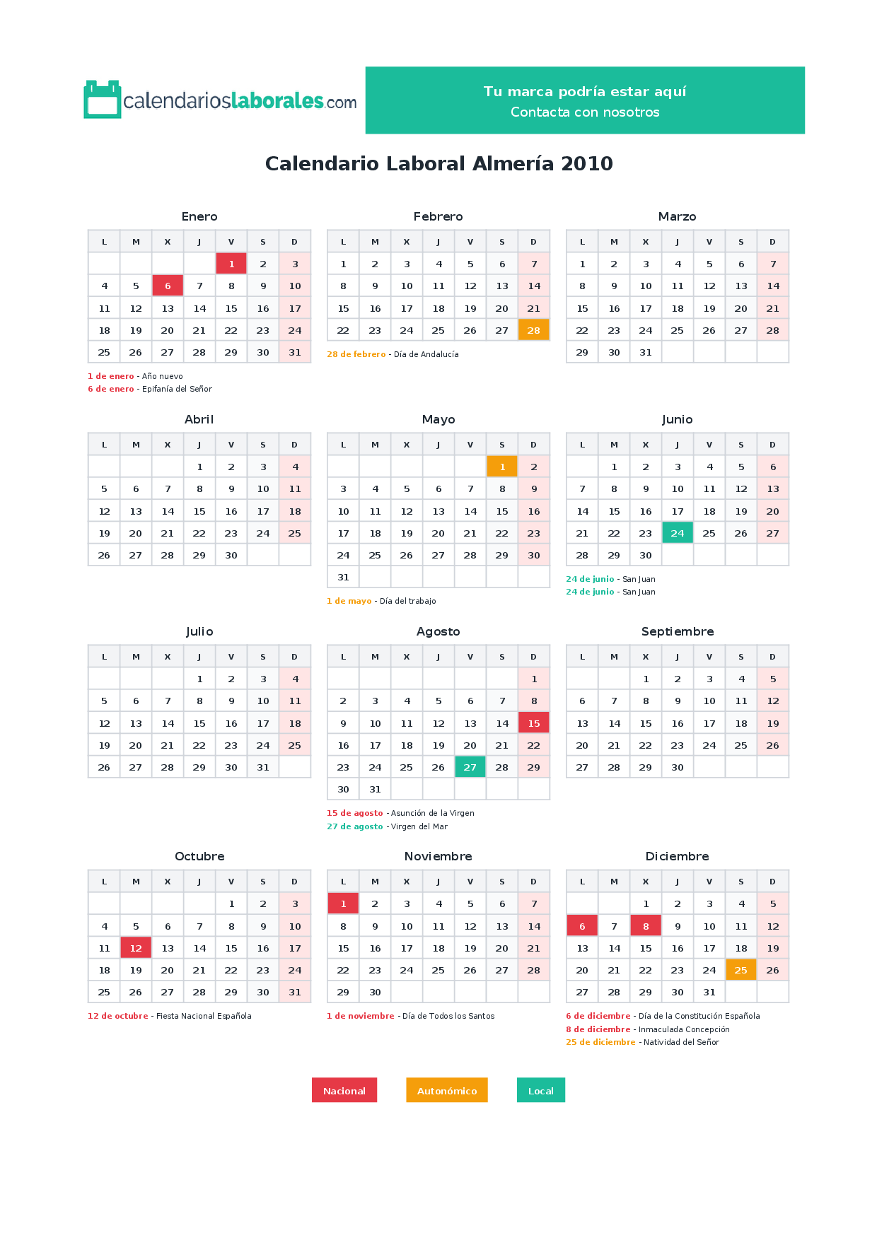 El calendario laboral de Almería en 2010 cuenta con un total de 12 días festivos, que incluyen festivos nacionales, festivos autonómicos de Andalucía y los festivos locales establecidos por cada municipio.