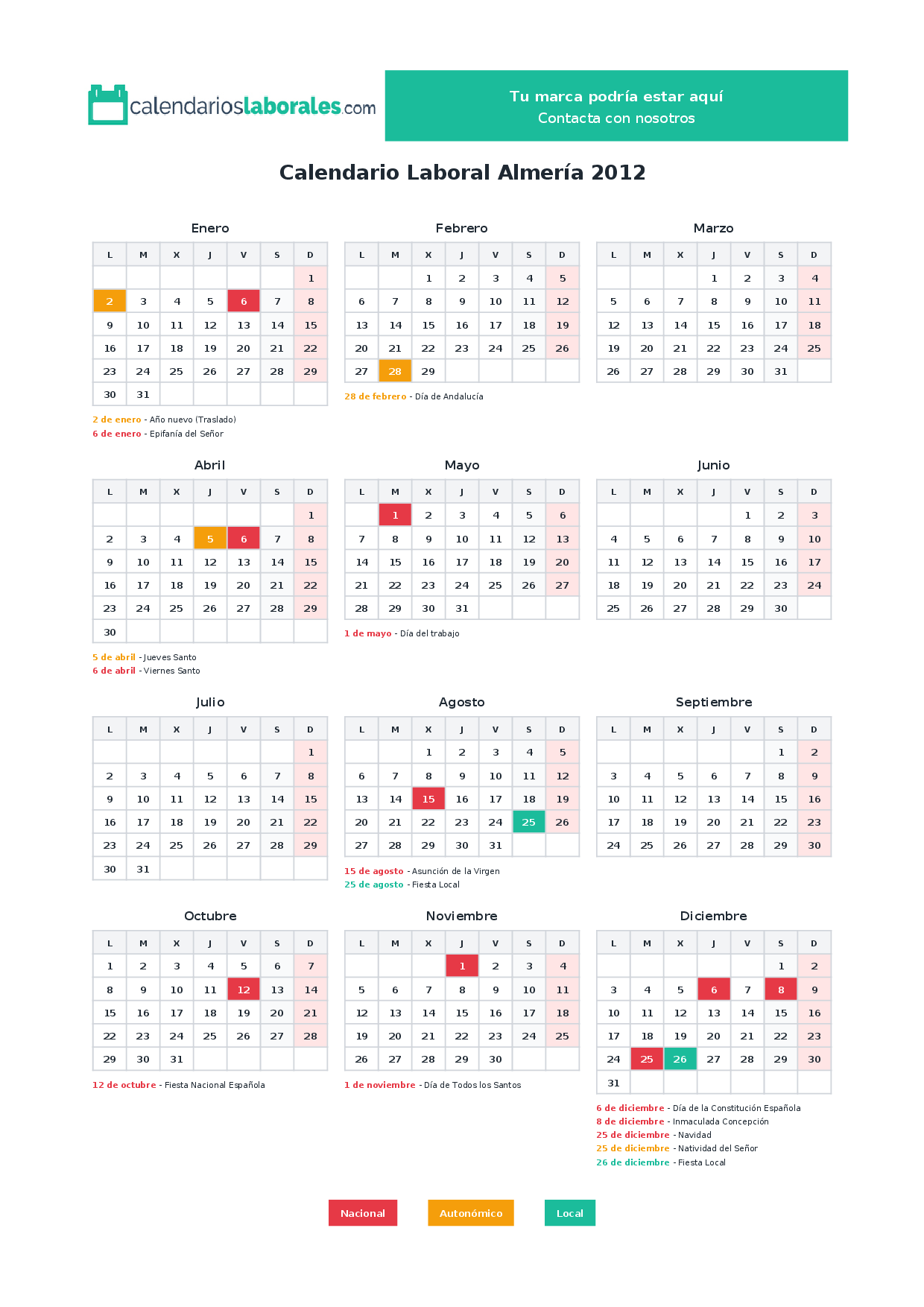 El calendario laboral de Almería en 2012 cuenta con un total de 14 días festivos, que incluyen festivos nacionales, festivos autonómicos de Andalucía y los festivos locales establecidos por cada municipio.