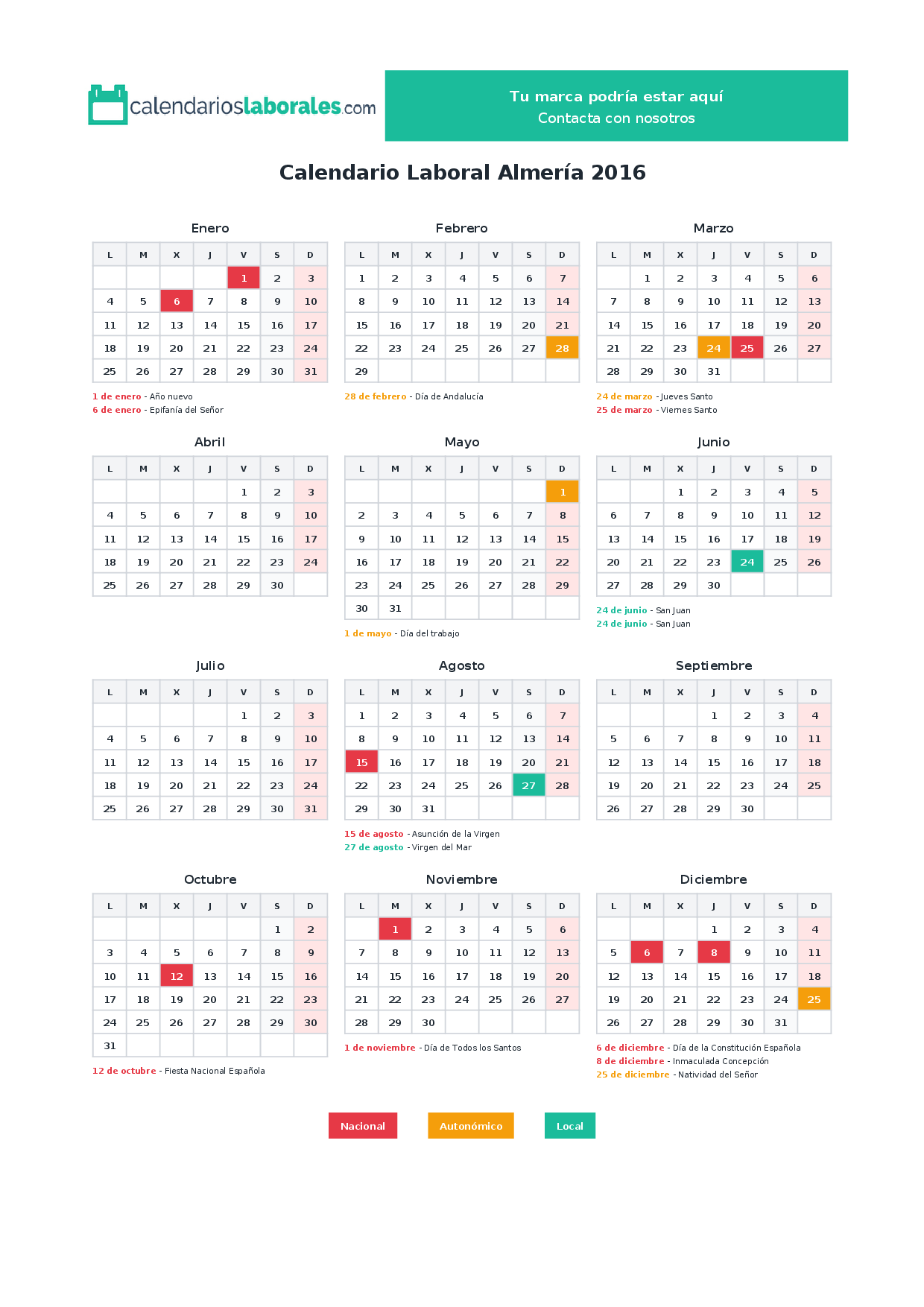 El calendario laboral de Almería en 2016 cuenta con un total de 14 días festivos, que incluyen festivos nacionales, festivos autonómicos de Andalucía y los festivos locales establecidos por cada municipio.
