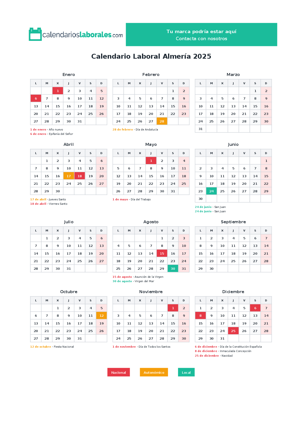 El calendario laboral de Almería en 2025 cuenta con un total de 14 días festivos, que incluyen festivos nacionales, festivos autonómicos de Andalucía y los festivos locales establecidos por cada municipio.