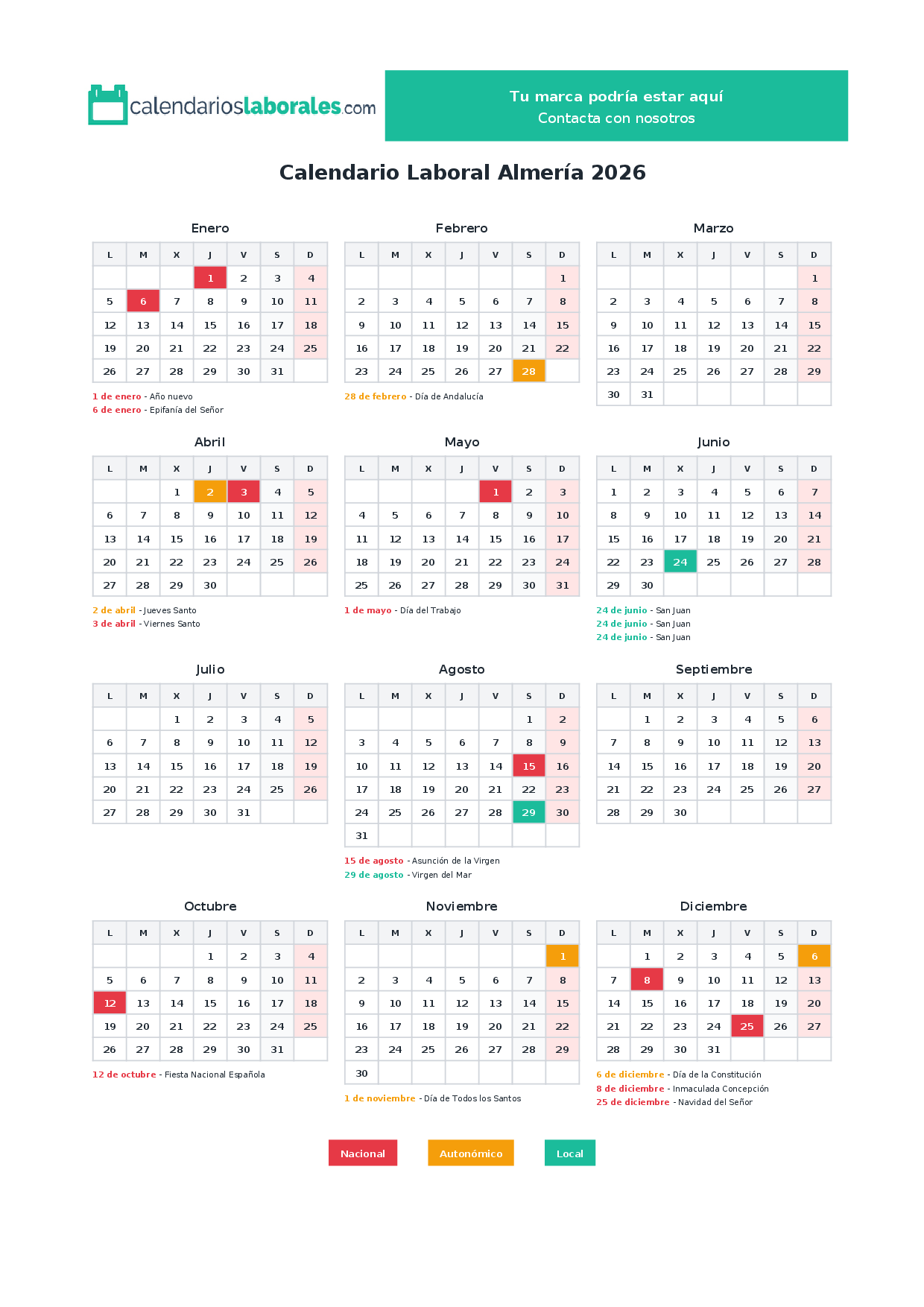 El calendario laboral de Almería en 2026 cuenta con un total de 14 días festivos, que incluyen festivos nacionales, festivos autonómicos de Andalucía y los festivos locales establecidos por cada municipio.