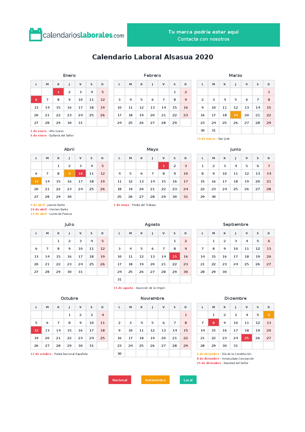 En 2020, 8 festivos nacionales se celebran en todo el territorio español, incluidos en el calendario laboral de Alsasua.