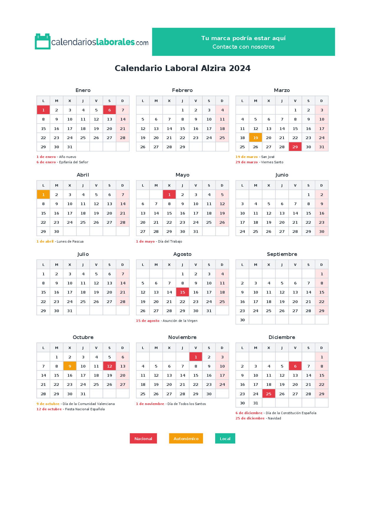 El calendario laboral de Alzira en 2024 incluye un total de 12 días festivos, que combinan festivos nacionales, festivos autonómicos de Comunidad Valenciana y los festivos locales propios del municipio.
