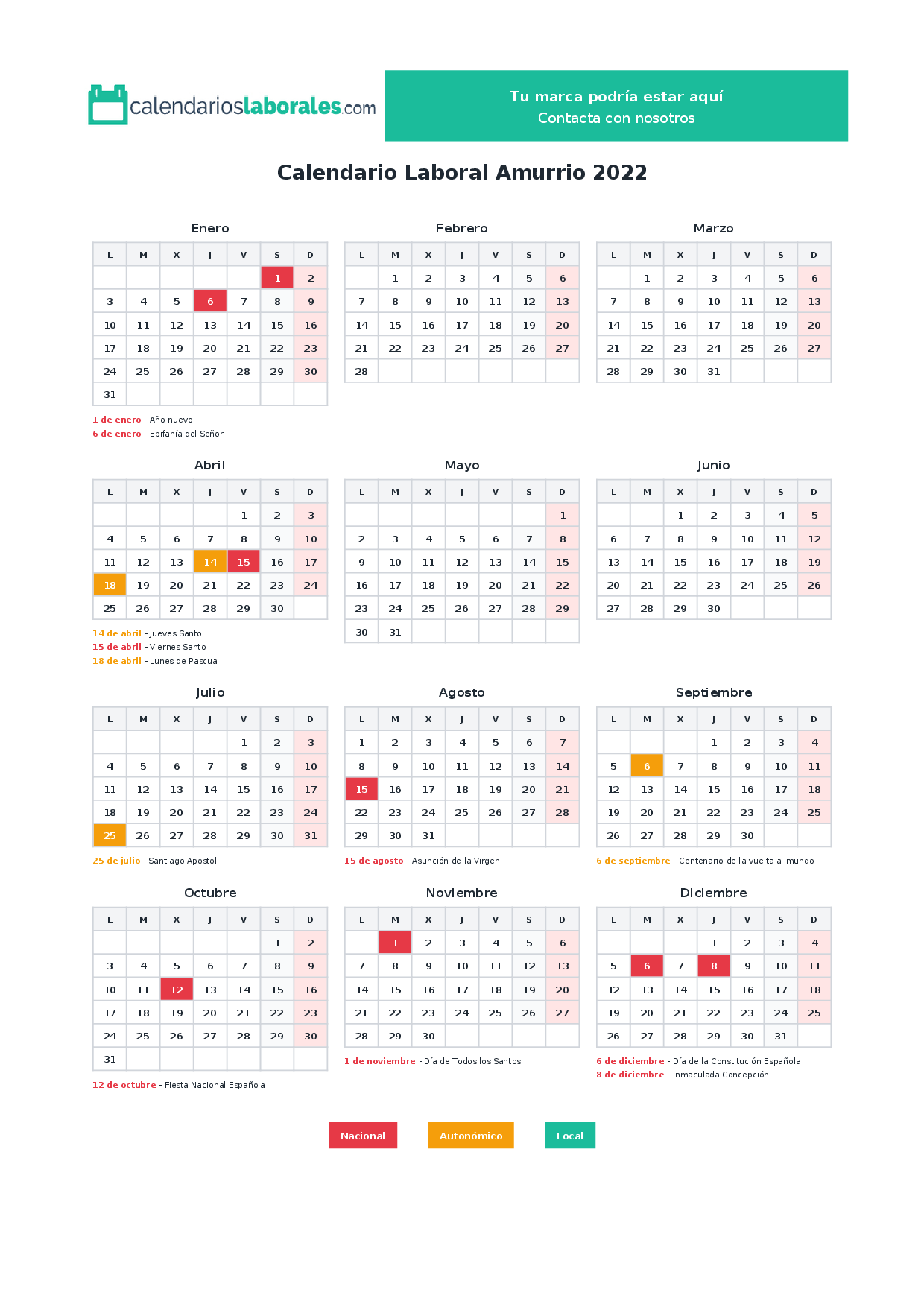 En 2022, 8 festivos nacionales se celebran en todo el territorio español, incluidos en el calendario laboral de Amurrio.
