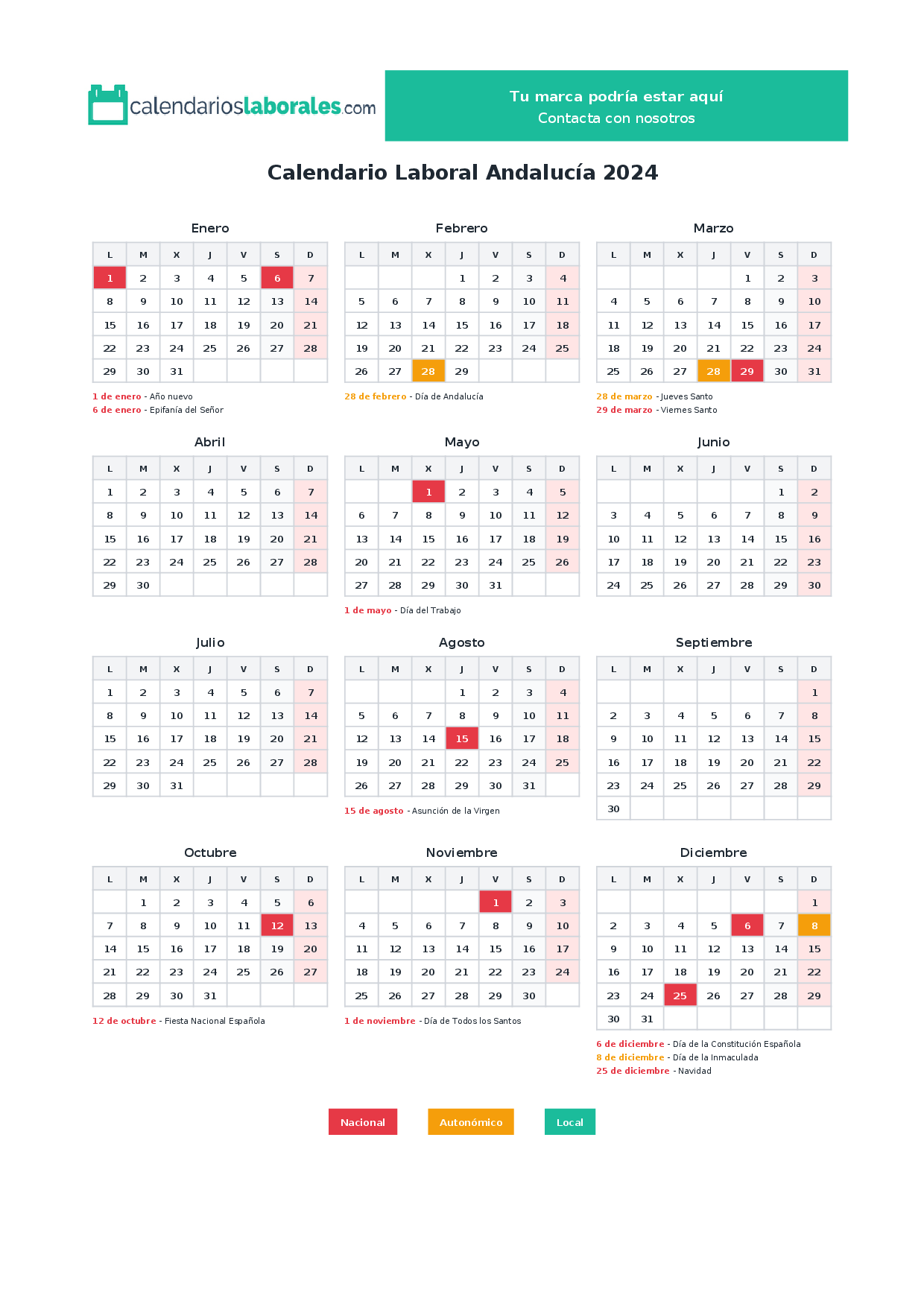 El calendario laboral de Andalucía en 2024 incluye un total de 12 días festivos, que combinan festivos nacionales y festivos autonómicos establecidos por la comunidad autónoma.