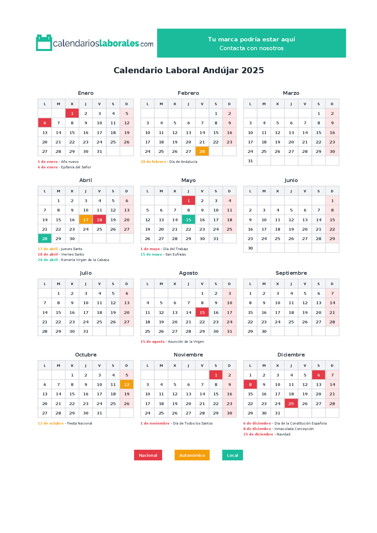 El calendario laboral de Andújar en 2025 incluye un total de 14 días festivos, que combinan festivos nacionales, festivos autonómicos de Andalucía y los festivos locales propios del municipio.