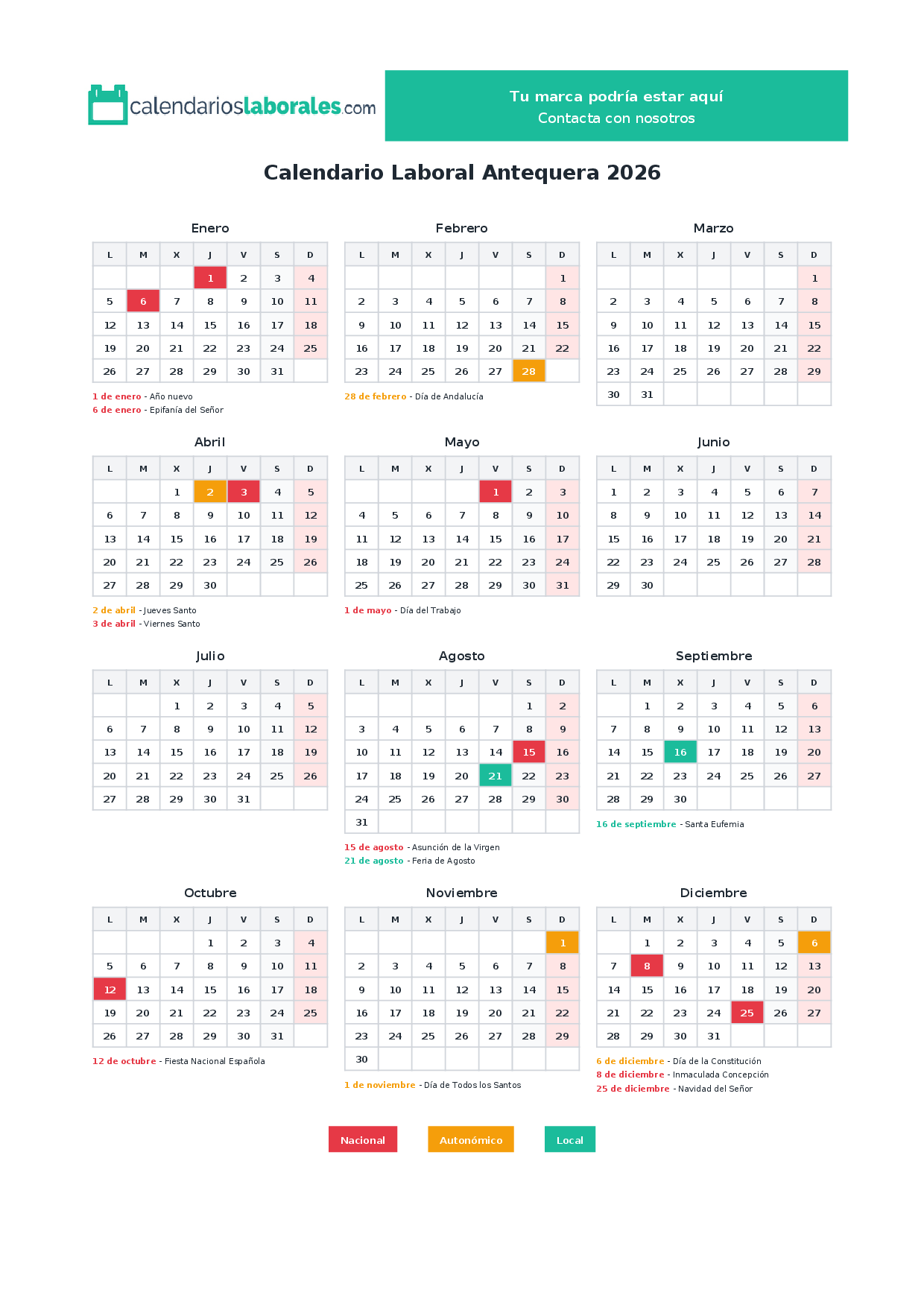 Además, el Ayuntamiento de Antequera fija 2 festivos locales que completan el calendario laboral del municipio.