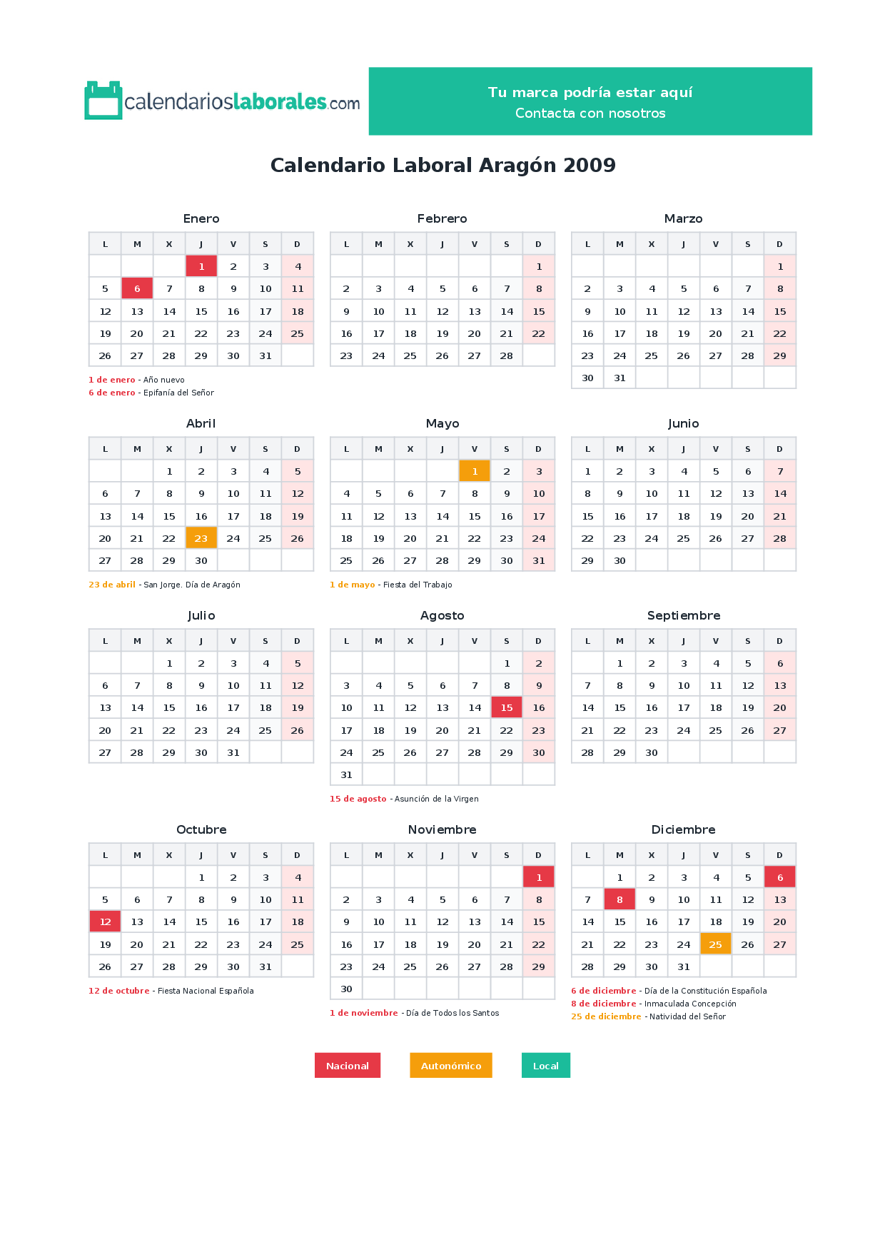 El calendario laboral de Aragón en 2009 incluye un total de 10 días festivos, que combinan festivos nacionales y festivos autonómicos establecidos por la comunidad autónoma.