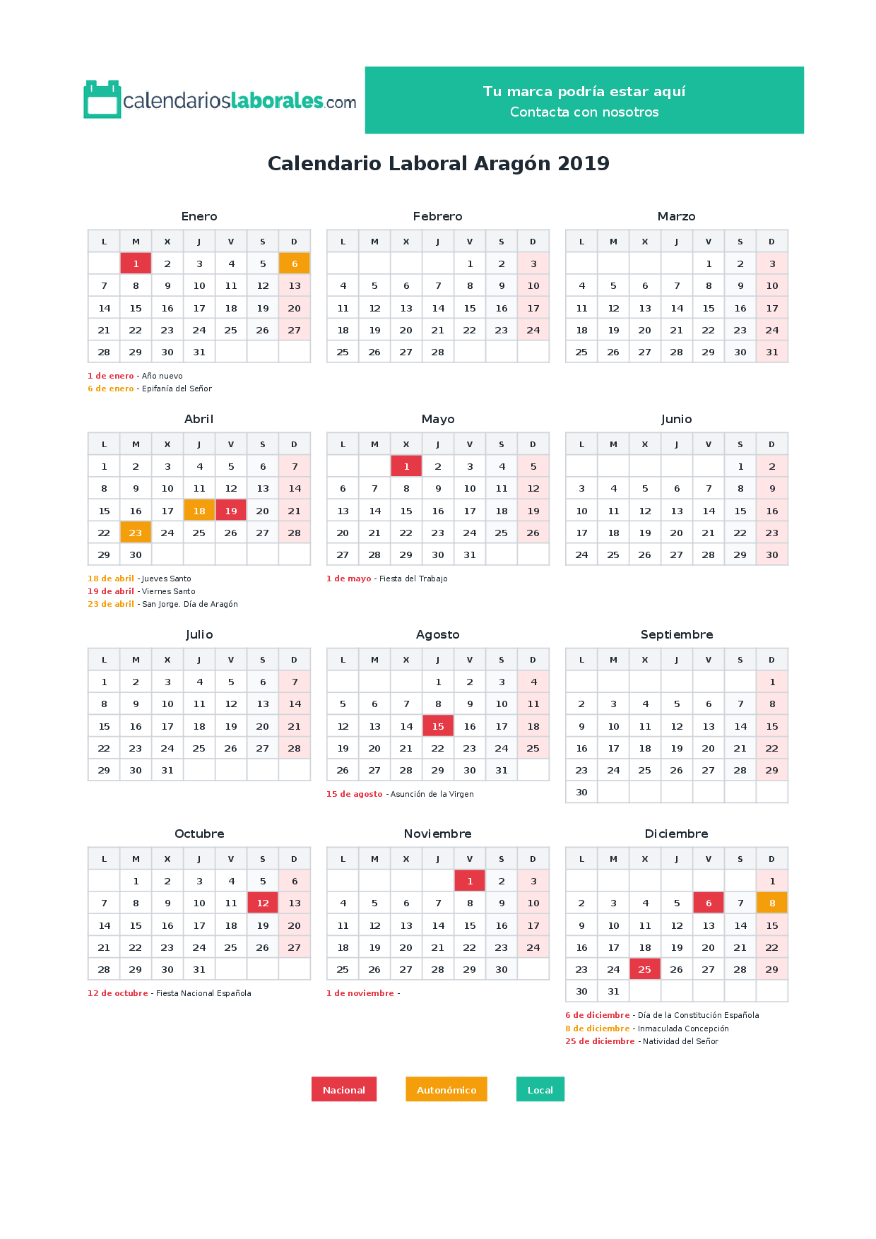 El calendario laboral de Aragón en 2019 incluye un total de 12 días festivos, que combinan festivos nacionales y festivos autonómicos establecidos por la comunidad autónoma.