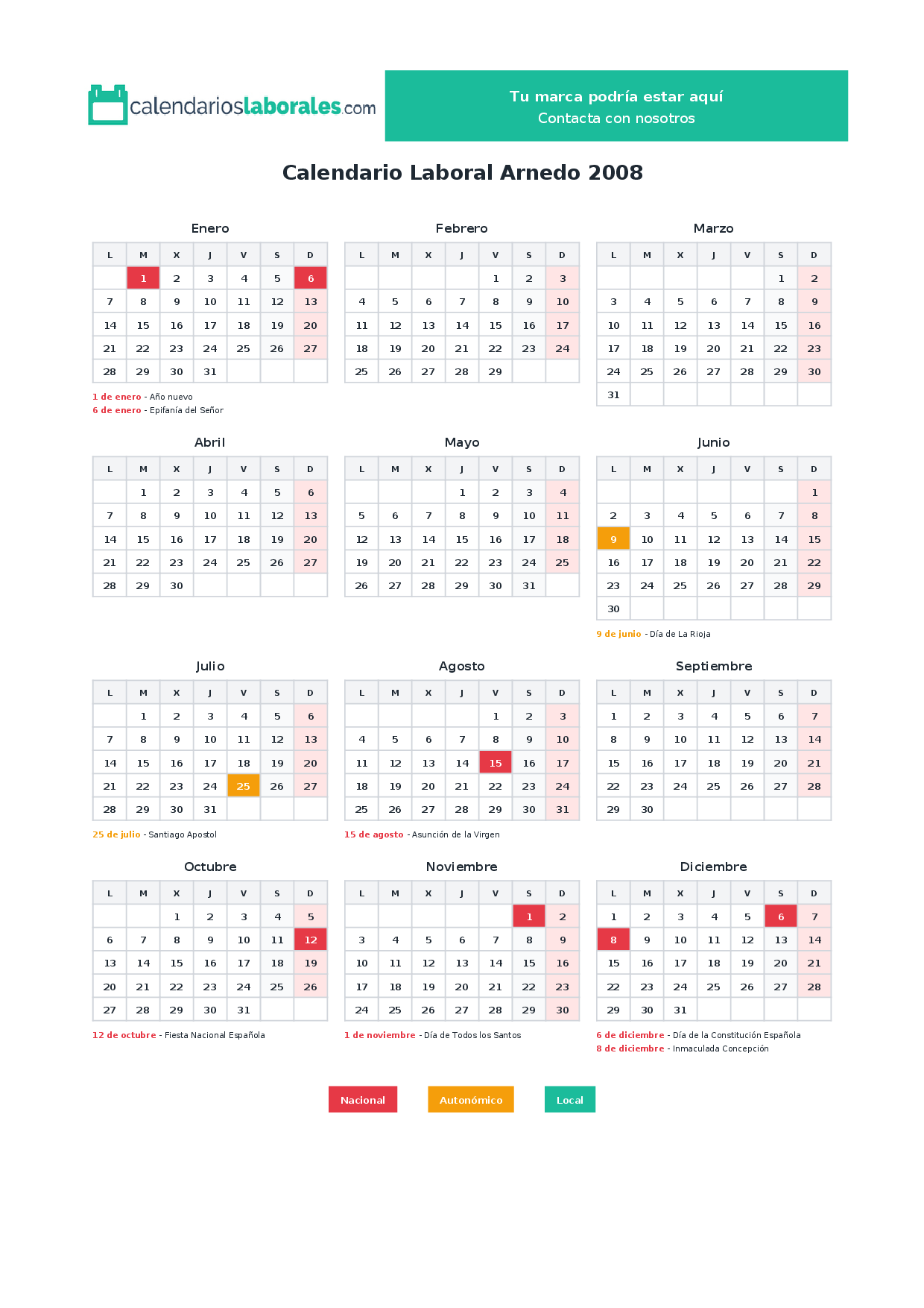 En 2008, 7 festivos nacionales se celebran en todo el territorio español, incluidos en el calendario laboral de Arnedo.