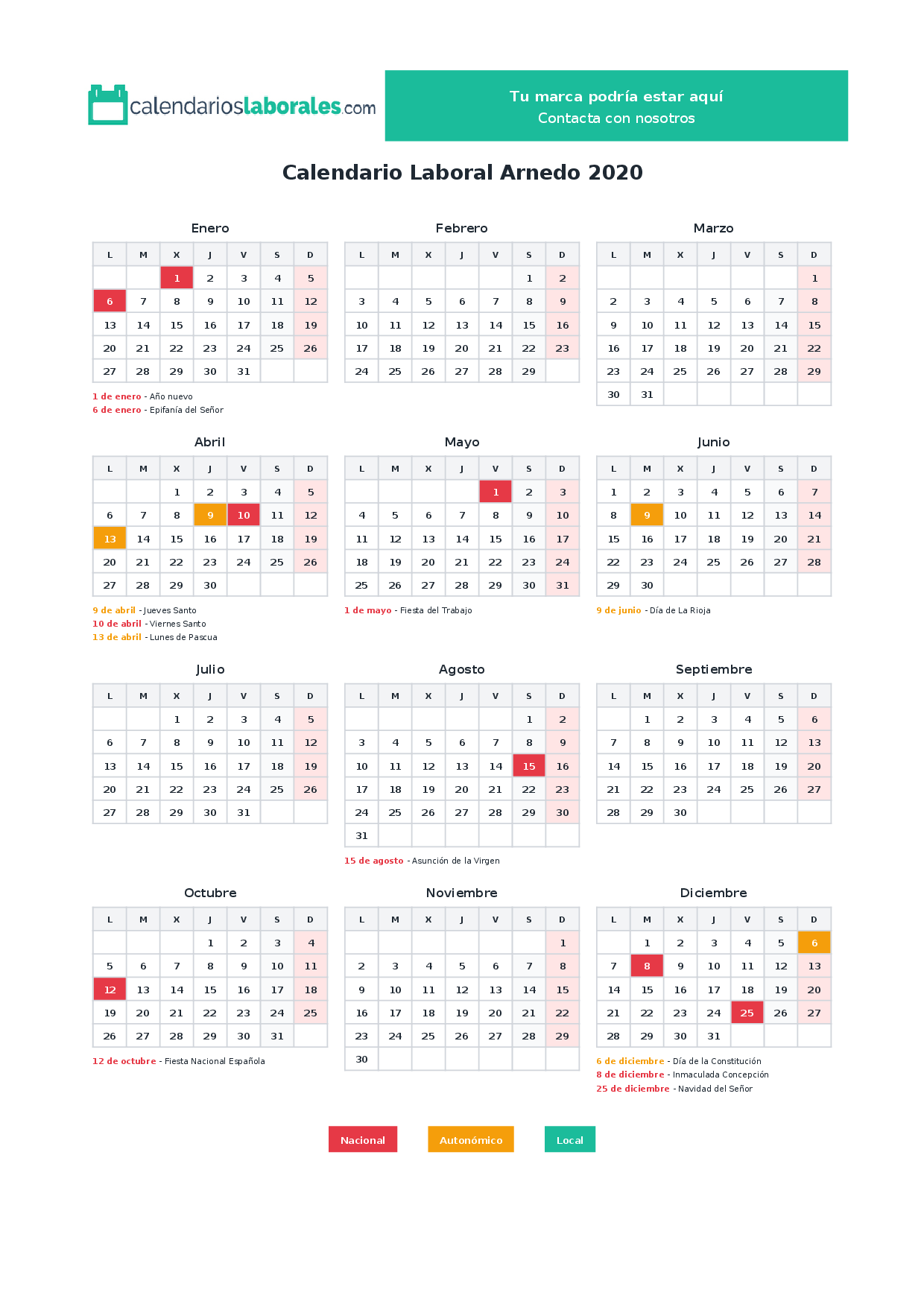 En 2020, 8 festivos nacionales se celebran en todo el territorio español, incluidos en el calendario laboral de Arnedo.