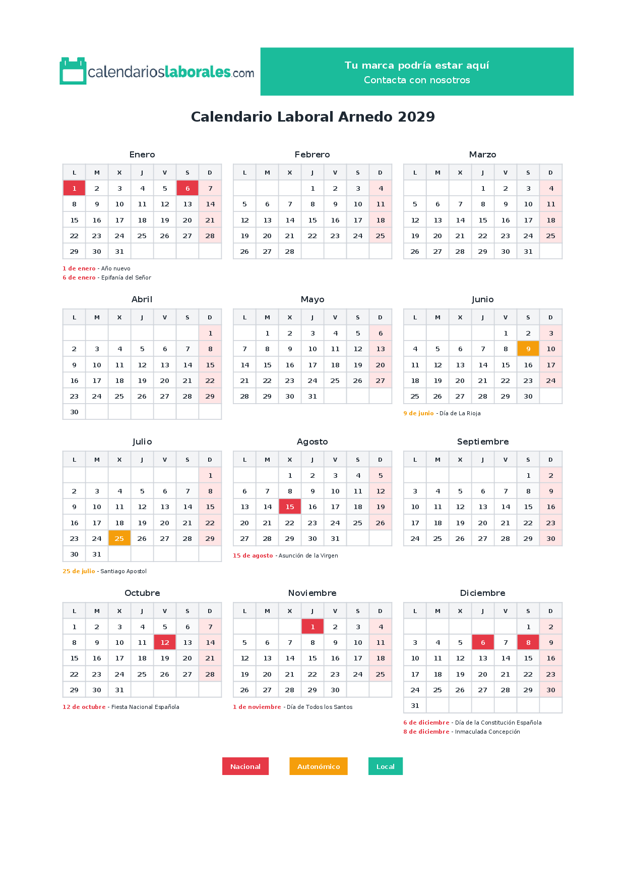 Calendario laboral Arnedo 2029