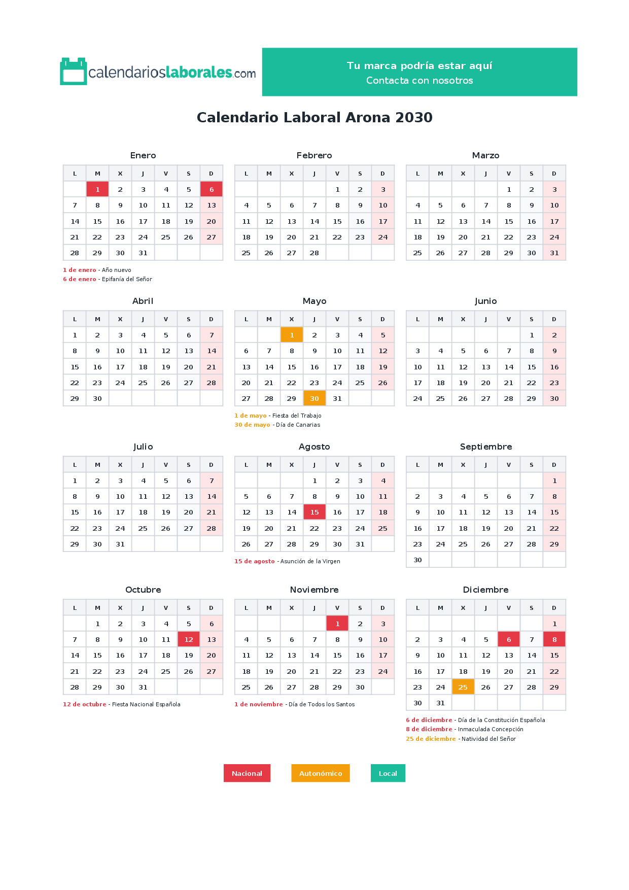 El calendario laboral de Arona en 2030 incluye un total de 10 días festivos, que combinan festivos nacionales, festivos autonómicos de Canarias y los festivos locales propios del municipio.