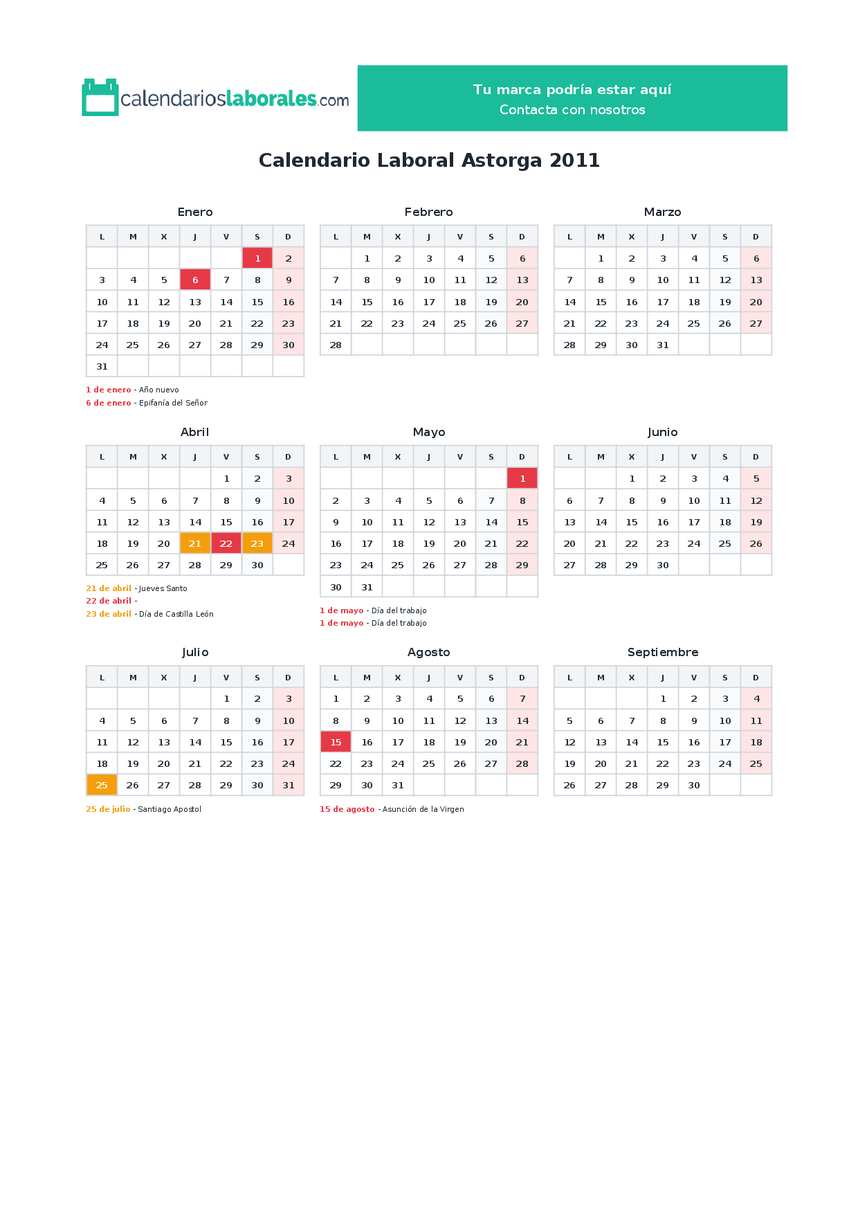 En 2011, 21 festivos nacionales se celebran en todo el territorio español, incluidos en el calendario laboral de Astorga.