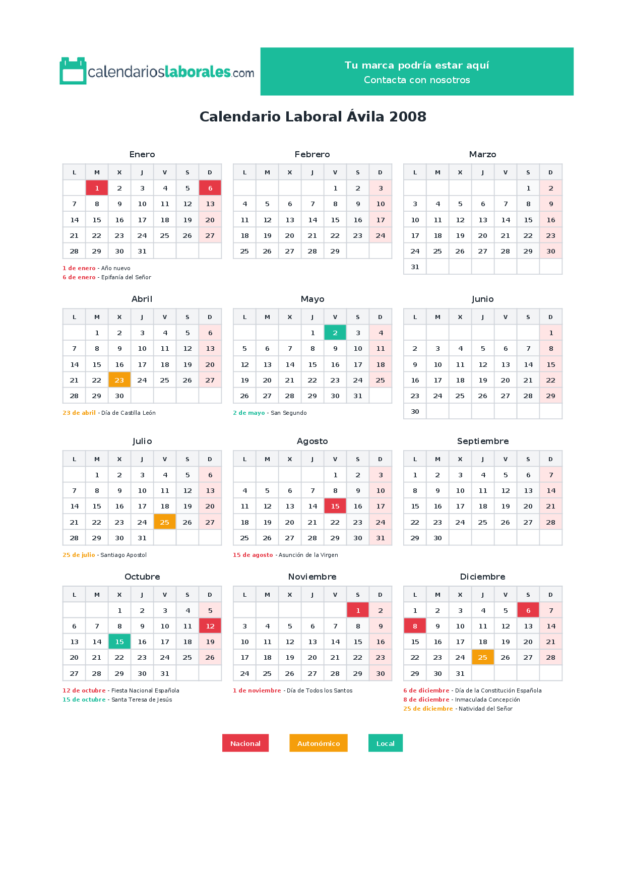 Calendario laboral Ávila 2008