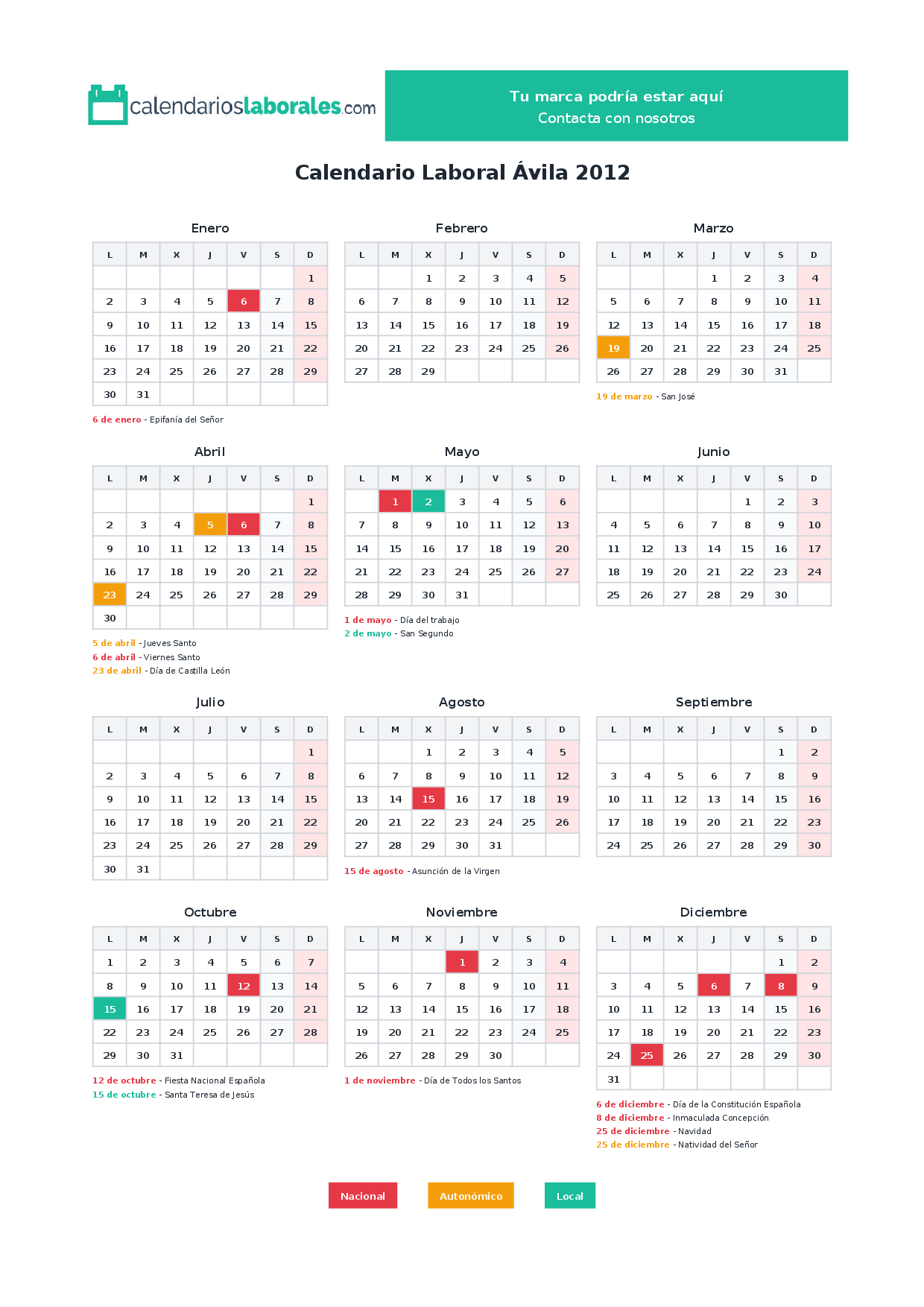 Calendario laboral Ávila 2012