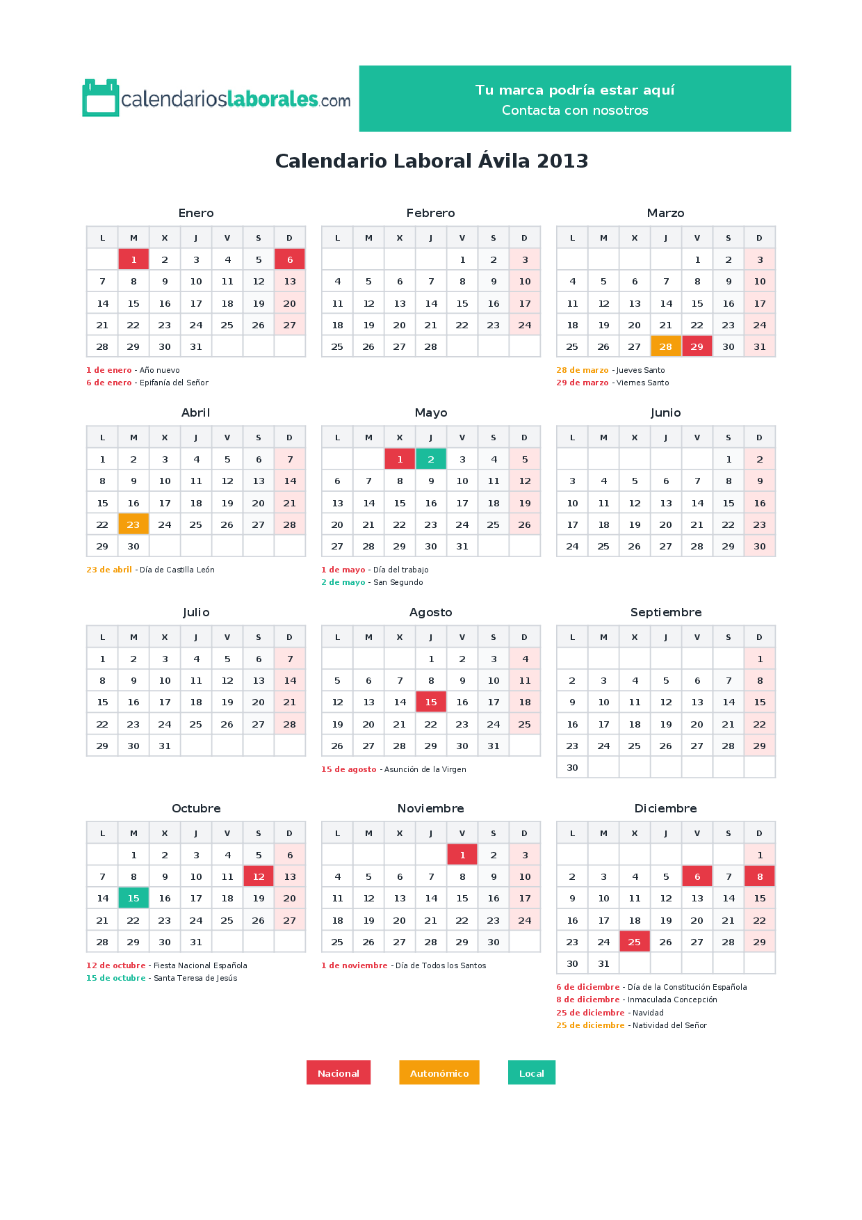 El calendario laboral de Ávila en 2013 cuenta con un total de 14 días festivos, que incluyen festivos nacionales, festivos autonómicos de Castilla León y los festivos locales establecidos por cada municipio.