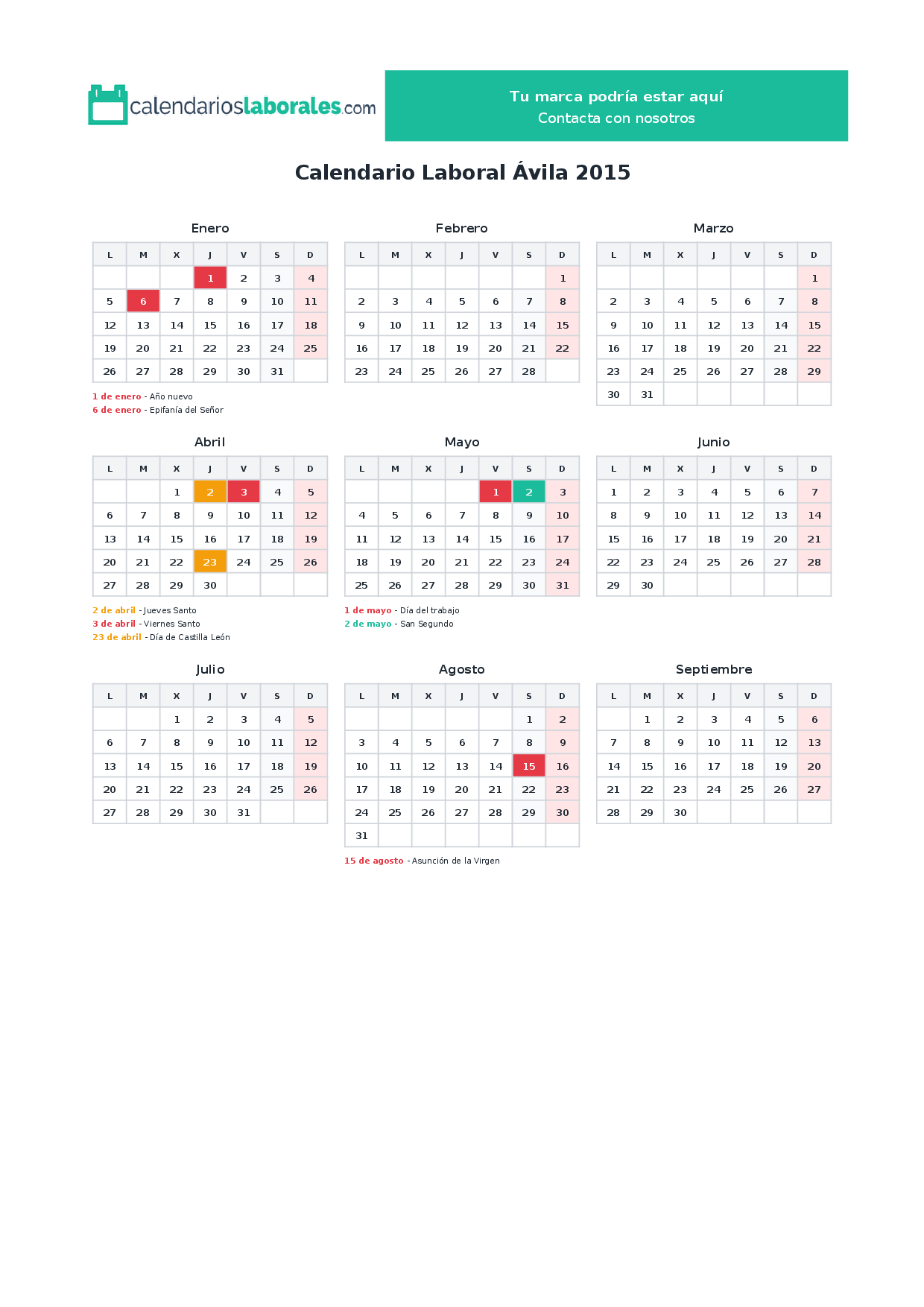 El calendario laboral de Ávila en 2015 cuenta con un total de 14 días festivos, que incluyen festivos nacionales, festivos autonómicos de Castilla León y los festivos locales establecidos por cada municipio.