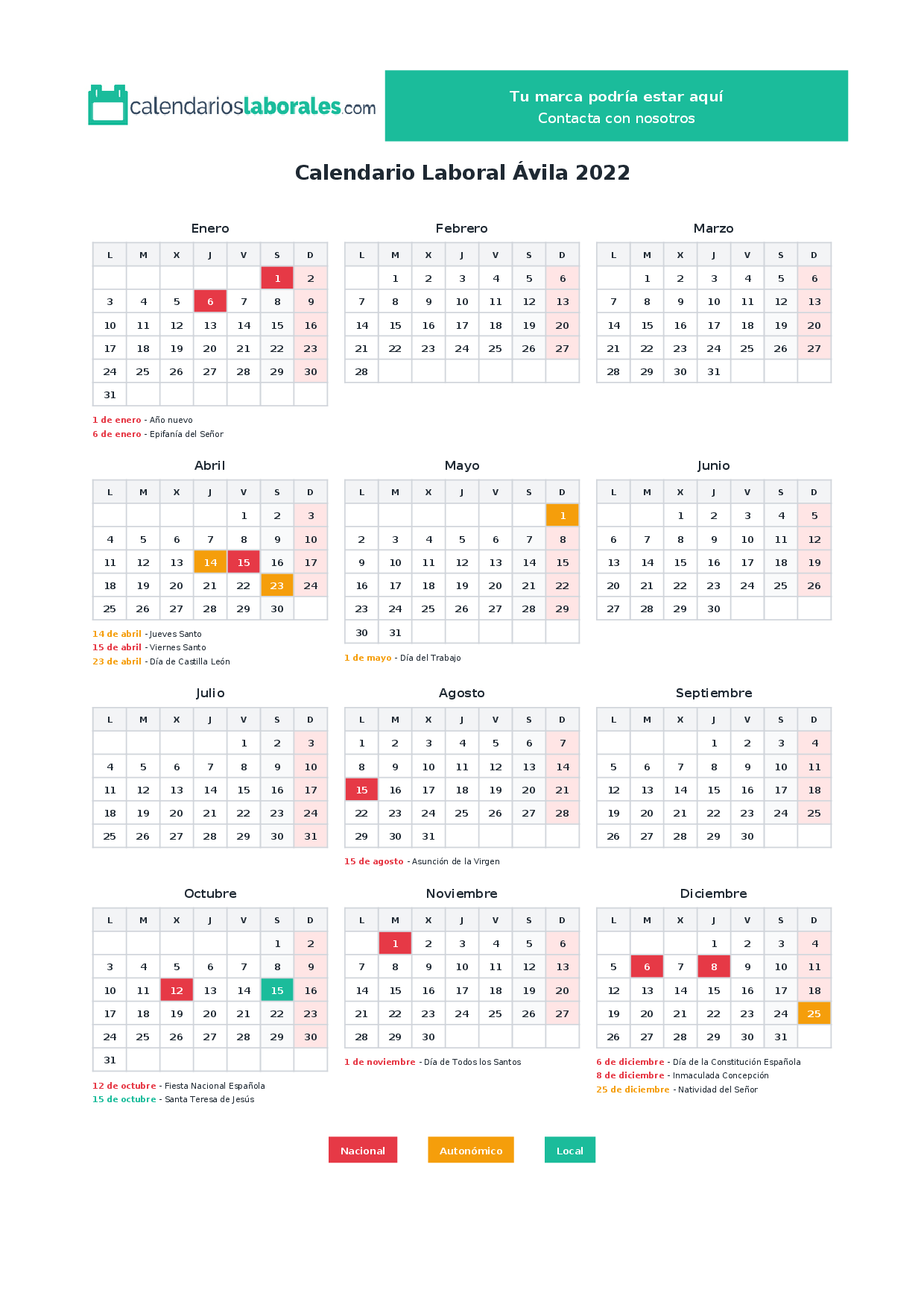 Calendario laboral Ávila 2022