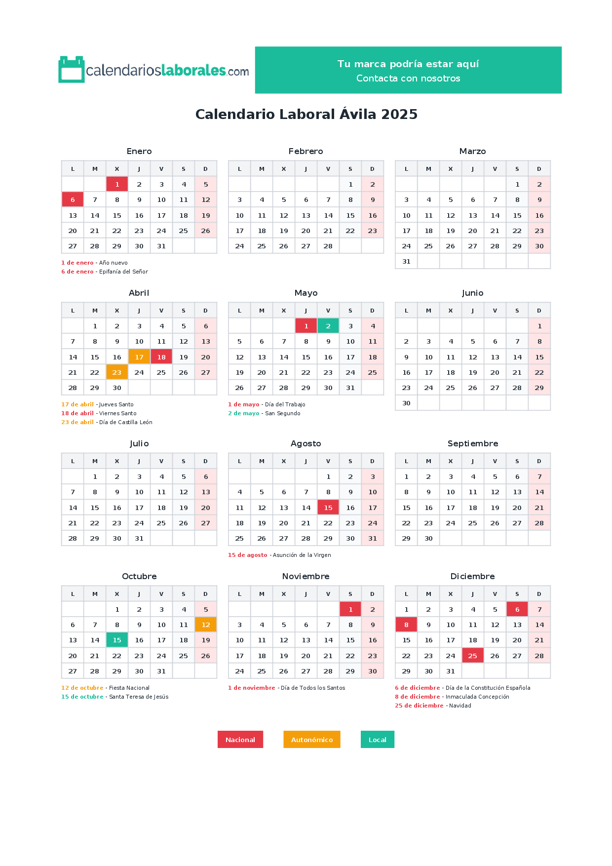 El calendario laboral de Ávila en 2025 cuenta con un total de 14 días festivos, que incluyen festivos nacionales, festivos autonómicos de Castilla León y los festivos locales establecidos por cada municipio.
