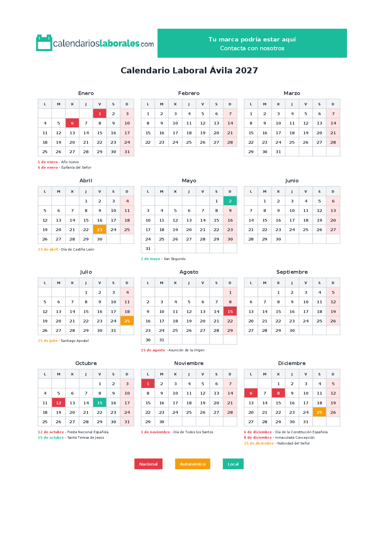Calendario laboral Ávila 2027