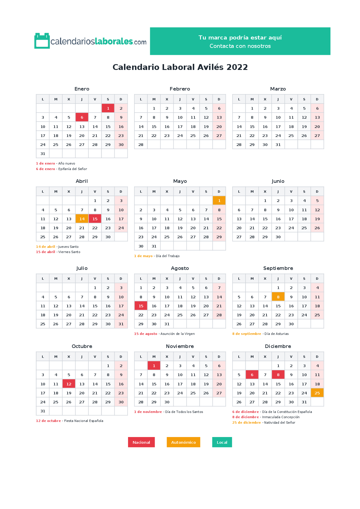 Calendario laboral Avilés 2022
